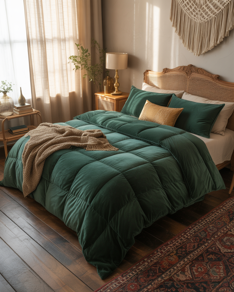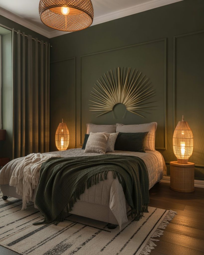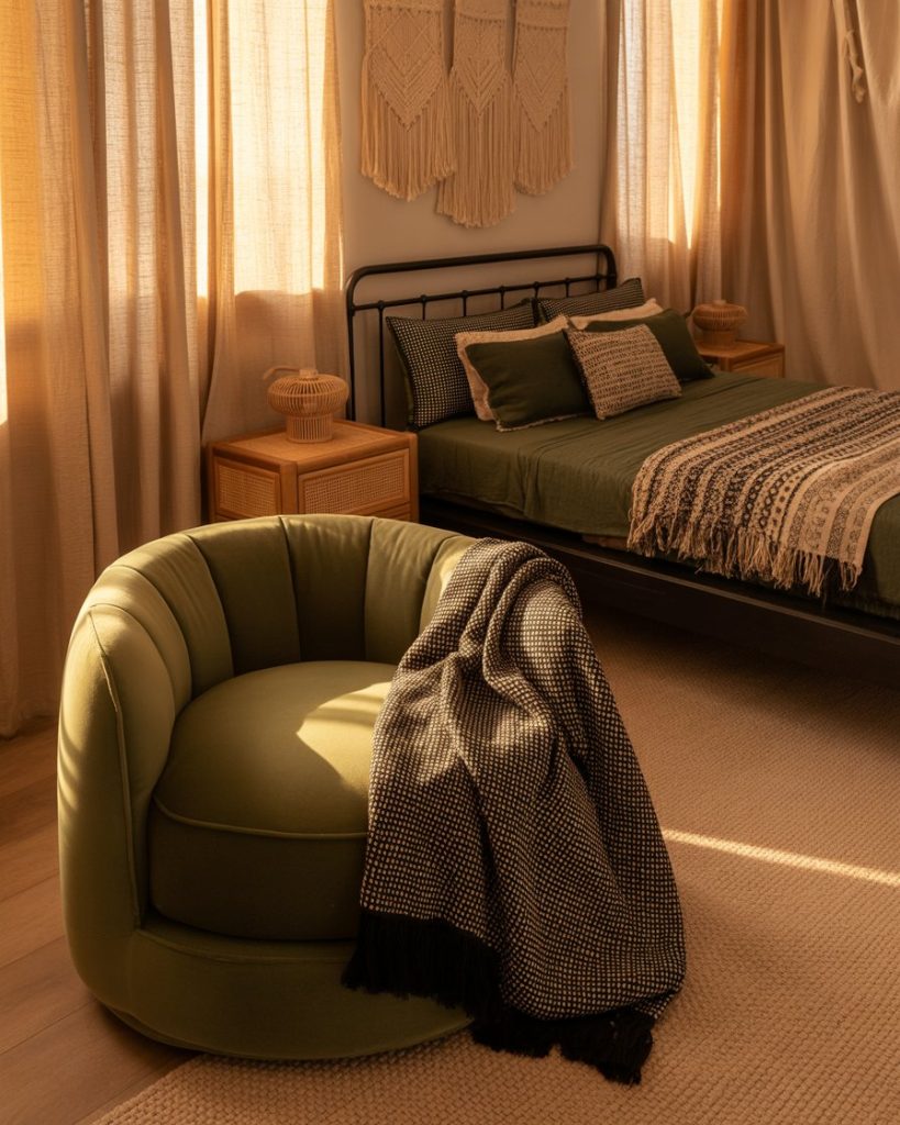 This moody boho idea celebrates the power of nature. Use deep green tones, leafy plants, and linen bedding to create a lush retreat. Add wooden shelves and earthy pottery for grounding. Soft light from floor lamps keeps it intimate. The effect is calming, sensual, and connected to nature’s rhythms.