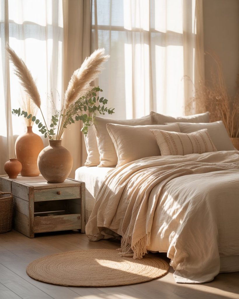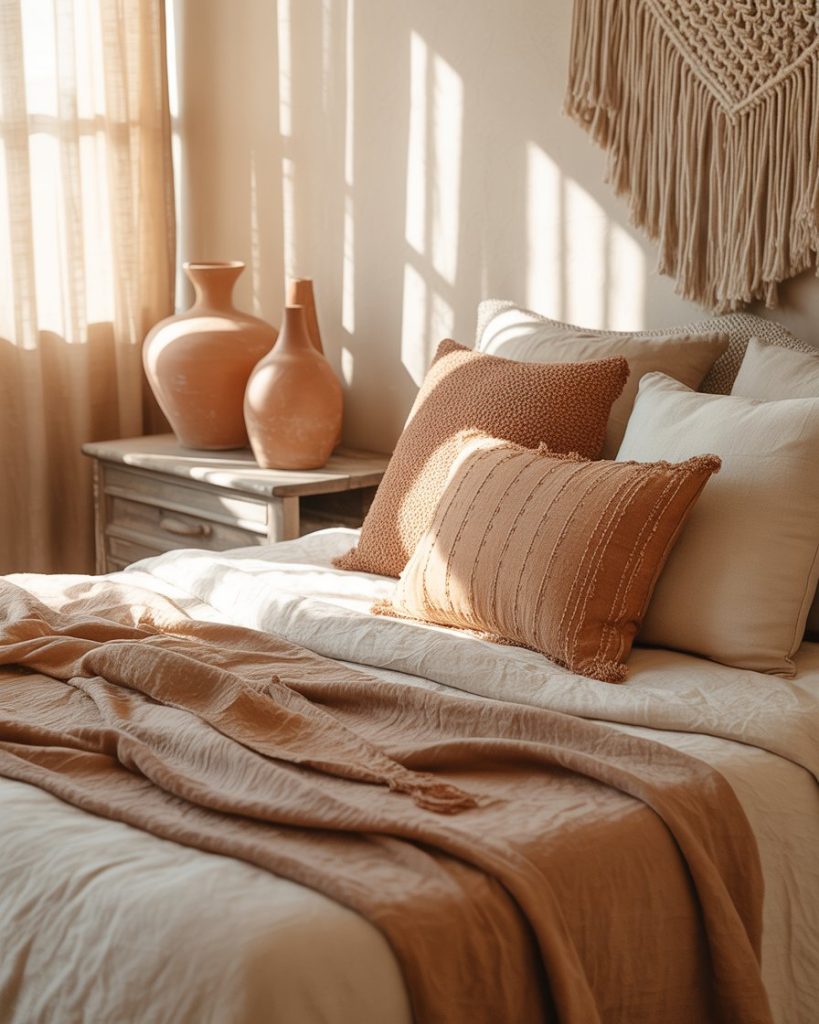 An earthy desert-inspired palette brings warmth and comfort. Mix sand, clay, and rust hues with woven rugs and linen fabrics. Add pampas grass and pottery for authentic charm. The result is a cozy and timeless design that mirrors the stillness of nature and the warmth of sunbaked earth.