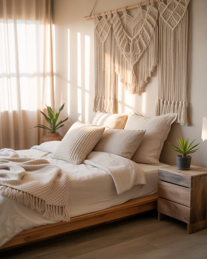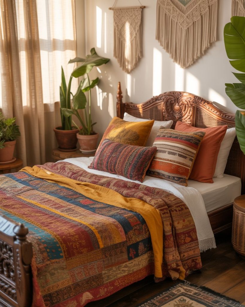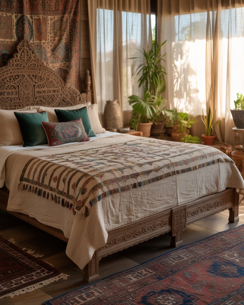 A coastal boho bedroom brings a beachy calm through whitewashed walls, linen bedding, and woven textures. Add blue and green pillows for an ocean breeze effect. Driftwood furniture and seashell art enhance the natural aesthetic, ideal for bright, airy homes. It’s easy, elegant, and effortlessly relaxing.