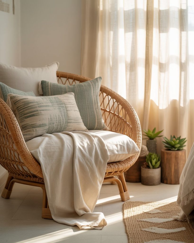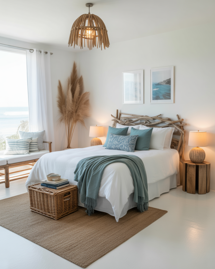 A beachy boho space radiates ease and simplicity. White walls, linen sheets, and woven baskets keep things airy. Add accents of blue and green for freshness. Inspired by coastal interiors, this design captures the essence of barefoot living with sophistication.