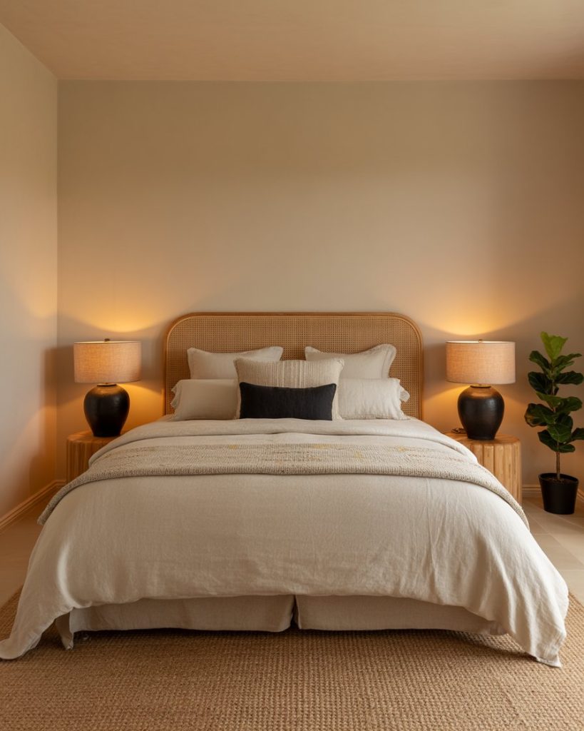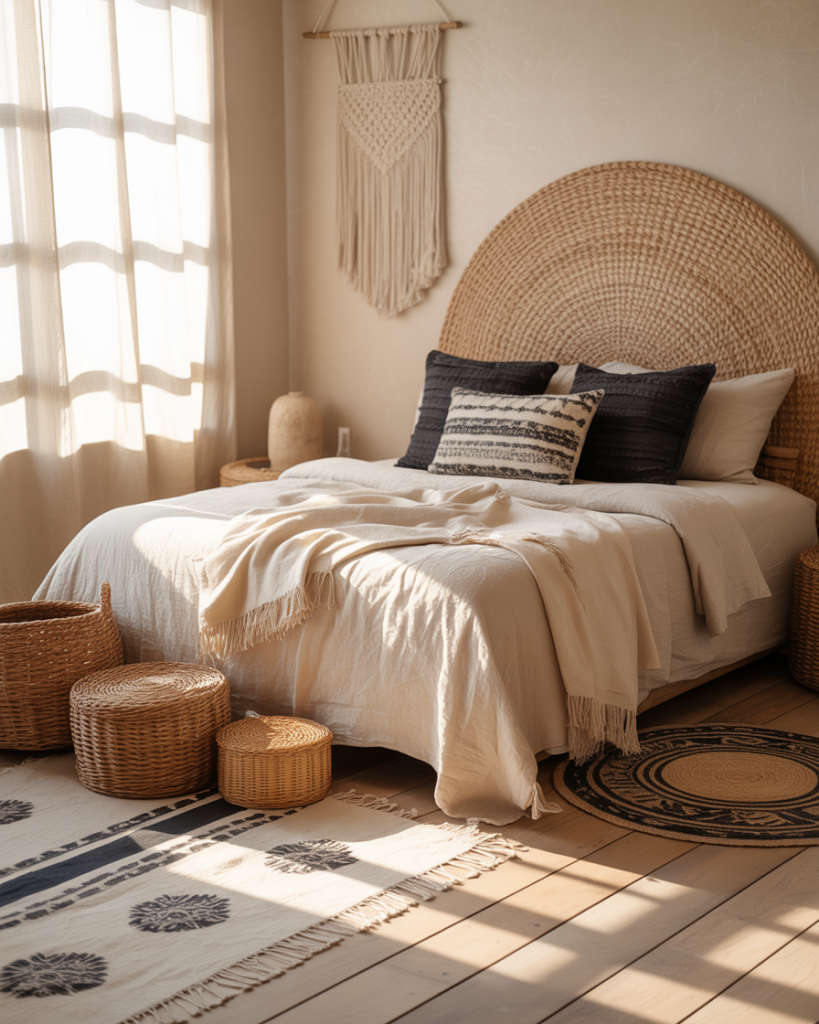 Combining black and neutral tones defines a modern yet soulful boho look. A black iron bed contrasts beautifully with rattan furniture and linen bedding. Add candles and macramé for softness. It’s an elegant fusion of structure and warmth, ideal for those who value balance.