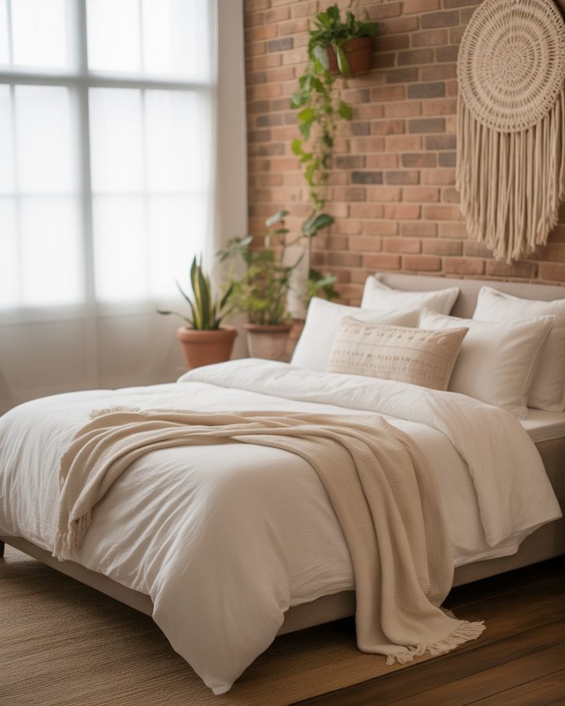 The minimalist urban boho style thrives in open spaces. Exposed brick, simple bedding, and green plants create natural charm. Add woven wall decor or tapestries to warm the industrial feel. Perfect for modern apartments, it balances raw energy with boho comfort.