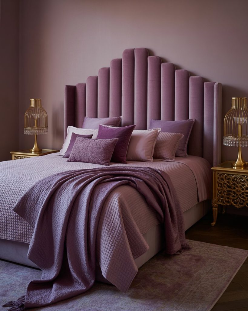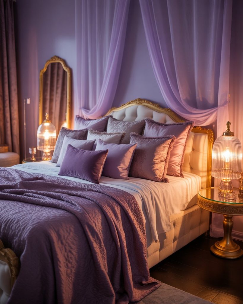 Soft lavender and purple hues transform a space into a tranquil dreamscape. Paired with cream bedding and wooden decor, these colors invite peace and introspection. Add hanging plants or abstract wall decor to complete the atmosphere. This gentle, meditative look is perfect for reading corners or serene bedrooms.