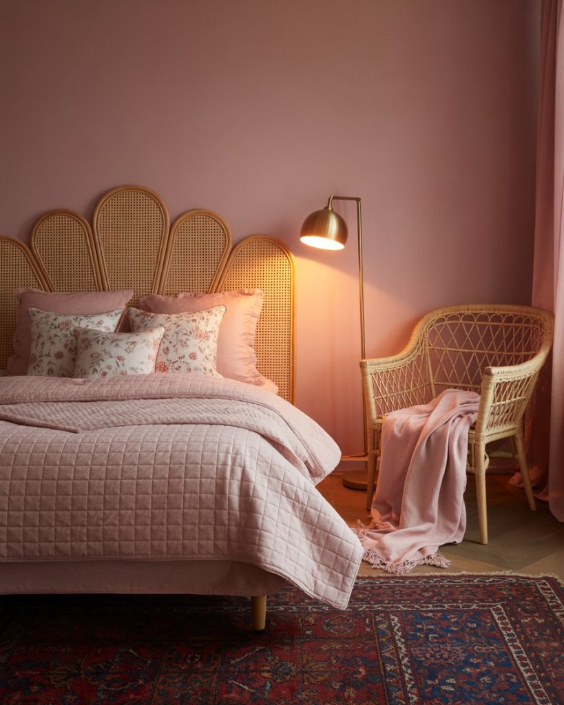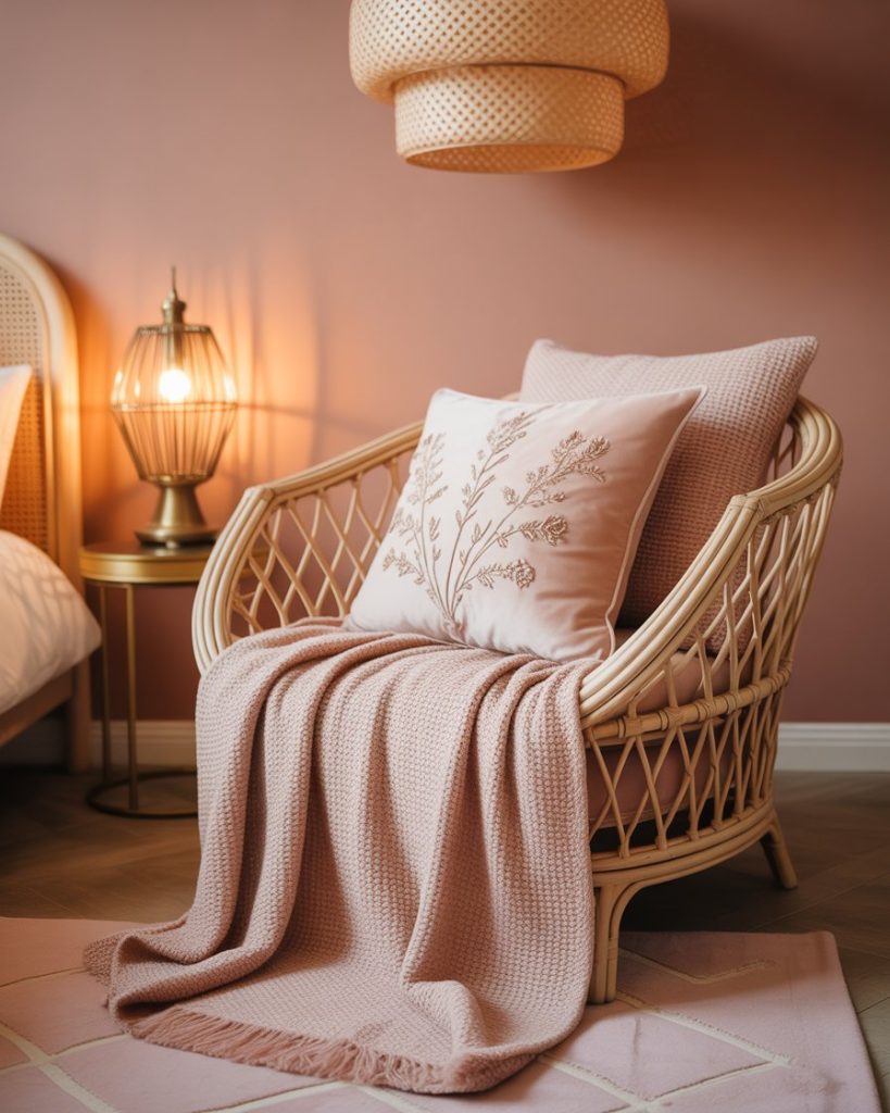 A pink boho bedroom introduces soft femininity and creativity. Combine blush and rose tones with rattan chairs and brass lamps. Fringed rugs and floral prints add charm without being overly sweet. This style feels both modern and warm, loved by followers of designer Justina Blakeney’s layered aesthetic.