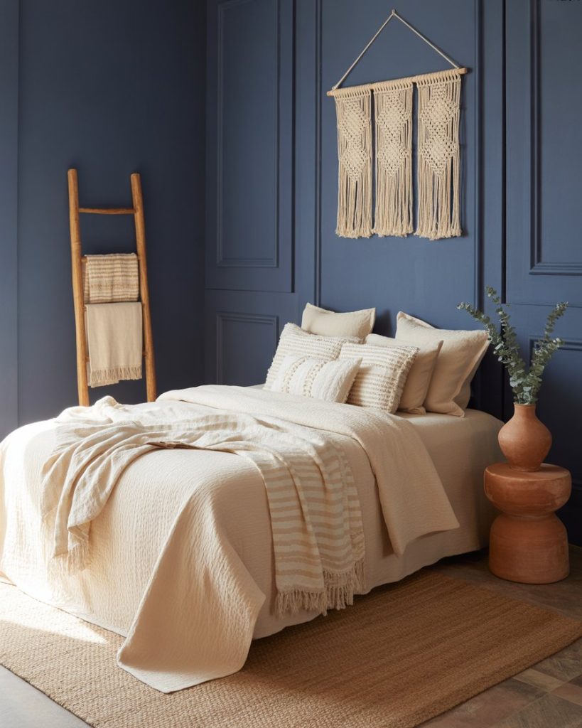 The union of navy blue and earthy neutrals grounds the space while adding bold character. Use navy bedding or paint paired with wooden frames, terracotta pots, and beige textiles. The look feels balanced, stylish, and inviting. It’s perfect for those who appreciate structure with natural warmth, as seen in Studio McGee’s modern designs.