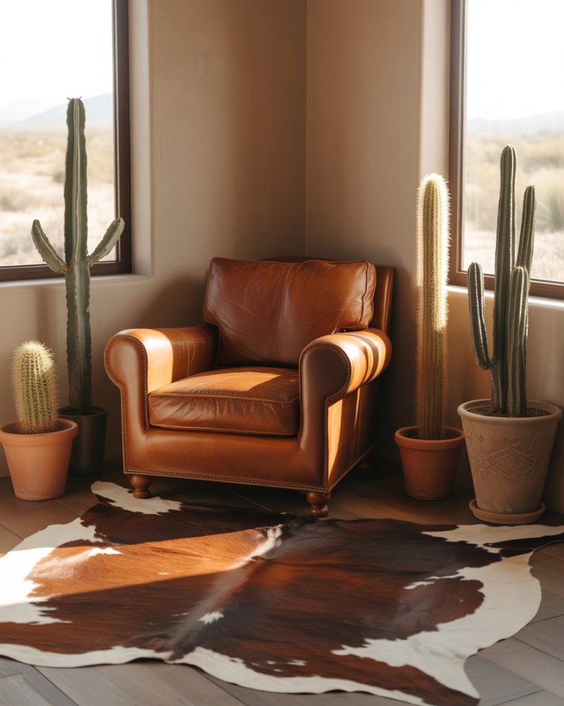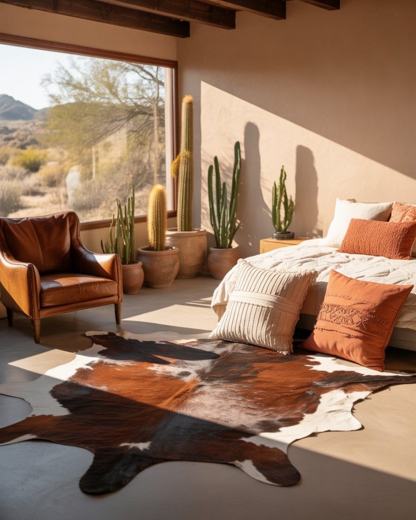 Western boho blends rustic charm with free-spirited texture. Picture cowhide rugs, leather chairs, green cacti, and rust-colored blankets. Natural light enhances its rugged beauty, while Navajo prints add storytelling detail. This eclectic style captures the heart of desert life and is trending in modern ranch homes.