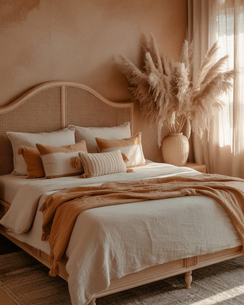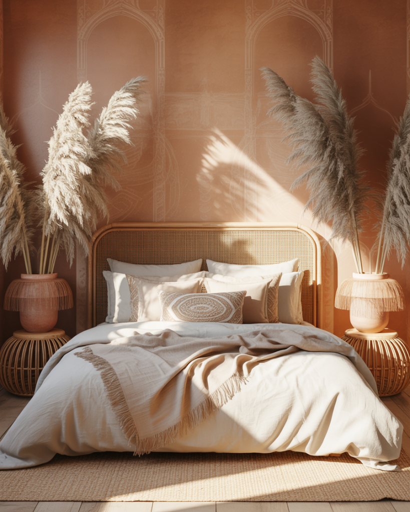 For the nature-inspired, 2026’s has rallied to the earthy boho. Woven wall hangings, rattan furniture, and clay tones turn the bedroom into a soulful, grounded retreat. It’s perfect for the cozy ladies’ ideas or couples’ ideas, providing layers of comfort. A terracotta wallpaper or pampas grass accent might add more life to the room.