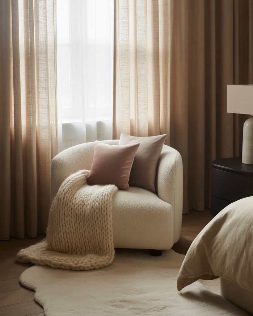Texture is everything when it comes to creating that balance for ideas for women luxury that also feel cozy. The combination involves layers of textures such as bouclé chairs mixed with silk pillowcases, wool throws, and linen curtains. This tactile richness will conjure a retreat that feels lavish, yet not quite out of reach. This is ideal for both small room apartments and spacious suites where these textured layers make the bedroom feel like a home.