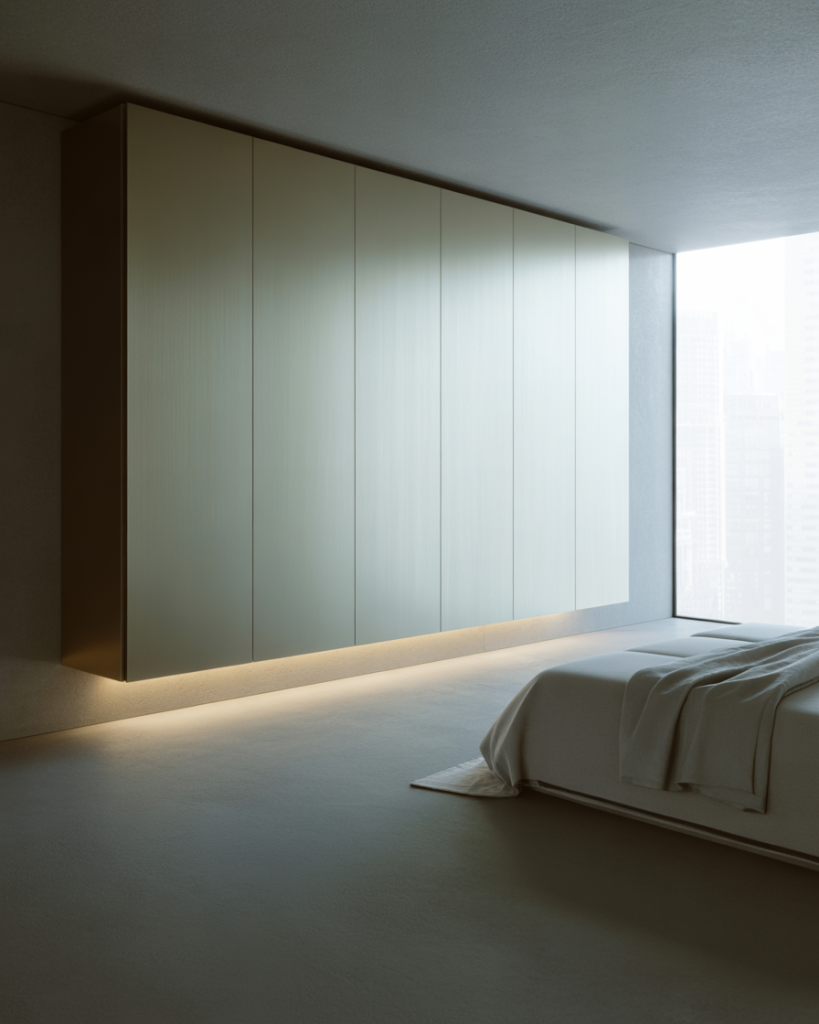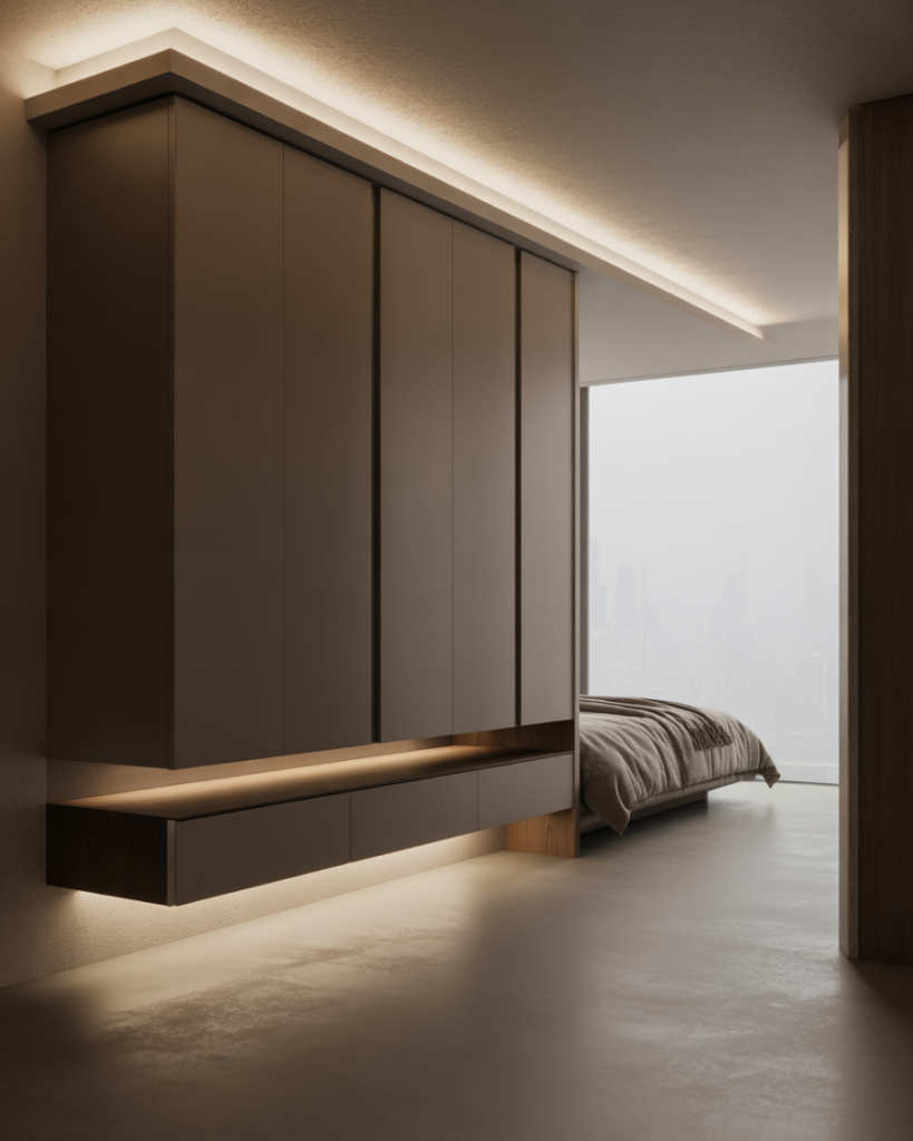 Wardrobe ideas in 2026 offer more than just storage; they quickly evolve into sculpture. Floating wardrobes, mounted just a little above the floor and usually lightly illuminated below, contribute a view of futuristic chic. This trend suits minimalist ideas for couples and women apartment ideas, where floor space is precious, keeping the room feeling airy with that luxury edge.