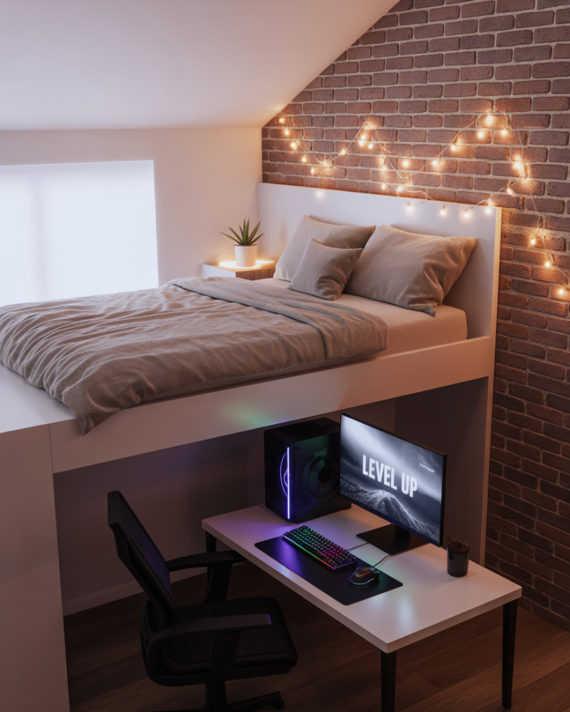 For those in small space apartments, loft-style setups are practical. Place a bed on a raised platform with your computer desk and tv below, making bedrooms small minimalist more efficient. This solution works well for students or young men who want to combine sleep, study, and play into one compact zone. The cozy vertical arrangement saves floor area without losing style.