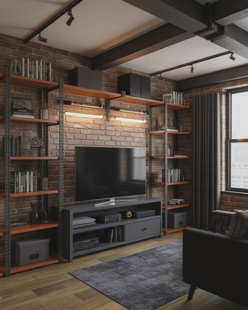 In 2026, the industrial look remains strong. Exposed brick walls, metal shelving, and matte black furniture create a rugged feel for a bedrooms man cave. Add a large tv, strong sound system, and a pc station to complete the setup. It’s especially popular among men who want their gaming space to feel bold, masculine, and timeless.