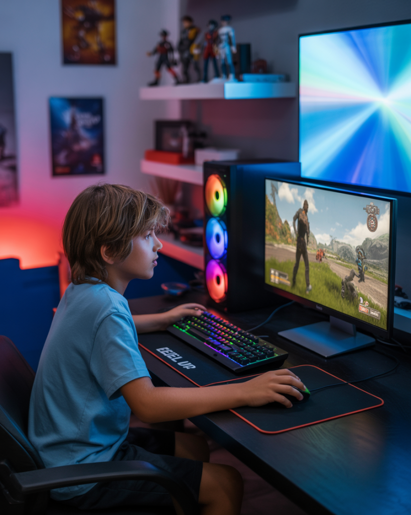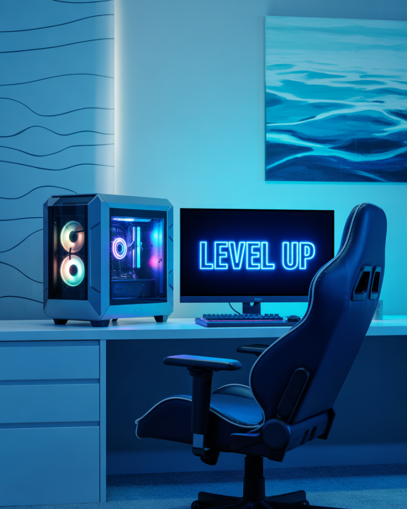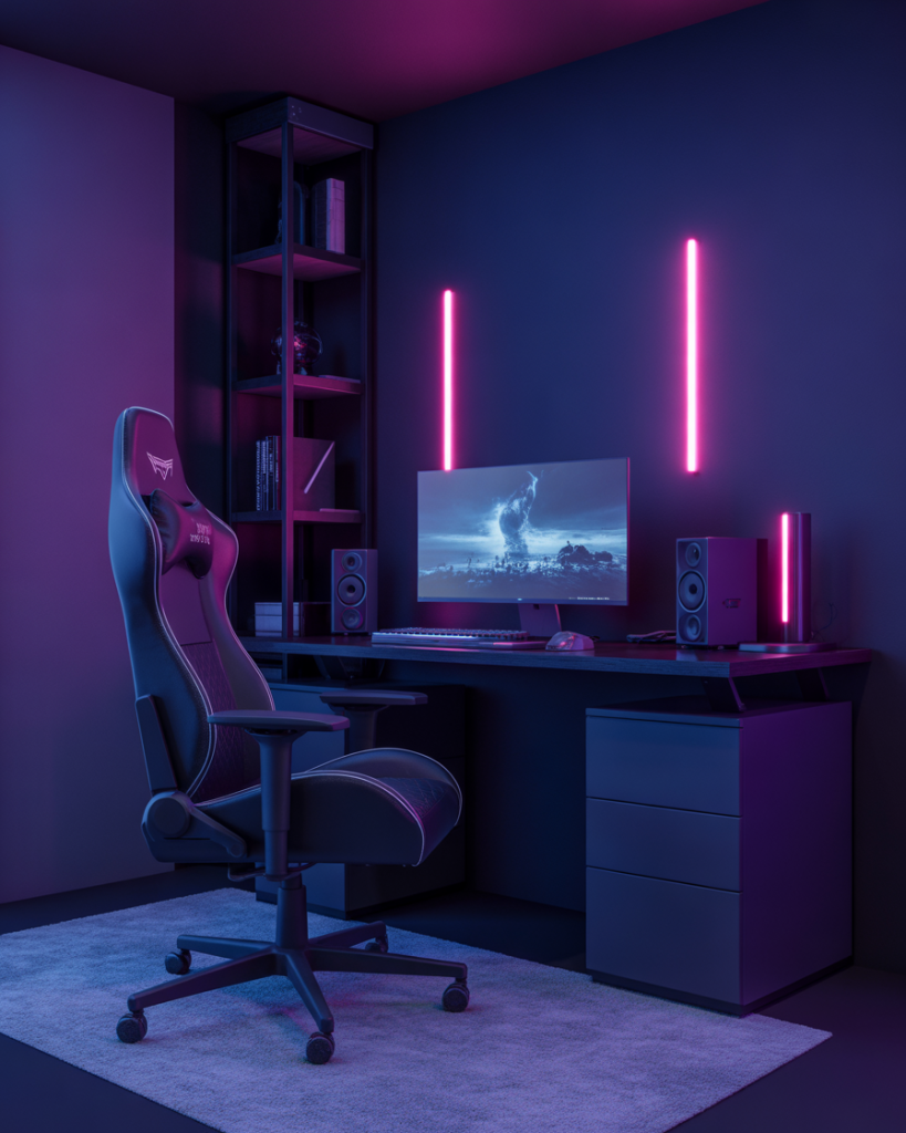 A blue theme creates a calm, wave-like atmosphere. Wall art, LED strips, and tv backlighting in shades of blue turn boys bedroom or shared setups into ocean-inspired sanctuaries. Paired with sleek pc rigs and comfortable chairs, this style is relaxing yet immersive. It’s great for gamers who want tranquility while still enjoying futuristic vibes.