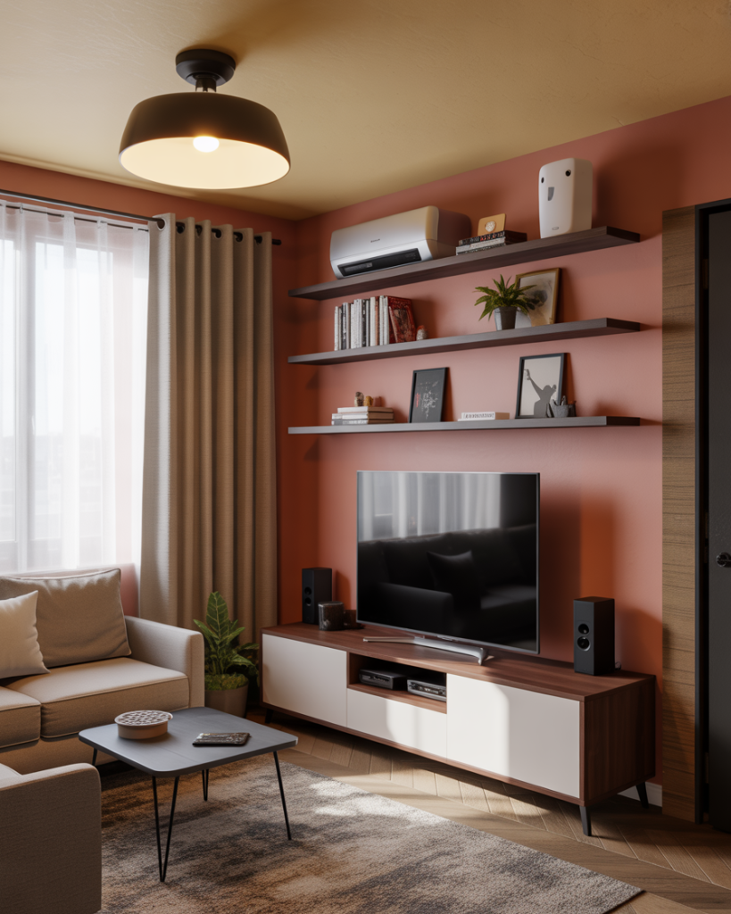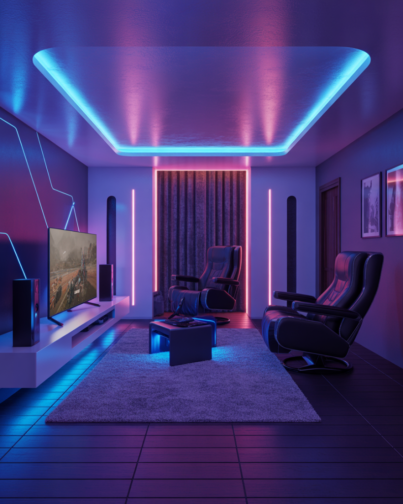Not every gamer needs a pc—sometimes a big tv with consoles like the PS5 is enough. For affordable couples or roommates, a central couch facing the TV works perfectly. Add floating shelves for games, subtle green plants, and LED strips for personality. This cozy idea is simple but effective for shared fun.