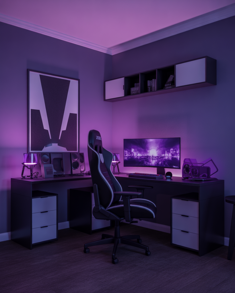 For those who love bold color, a purple-themed gaming space is stunning. Pair deep purple lighting with black furniture and sleek monitors for a dramatic aesthetic. Works well in boys bedroom or bedrooms small cozy layouts where you want style without clutter. This unique color choice creates a personal identity in the gaming world.