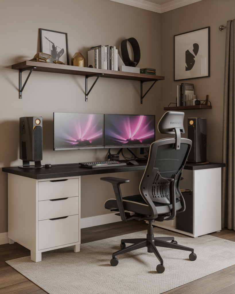 In 2026, many gamers also work from home. A hybrid setup combines a computer desk for productivity with a tv or second monitor for play. Neutral white and black tones keep it professional, while accents in blue or green add energy. This works perfectly in bedrooms small minimalist layouts or shared rooms where space must multitask.