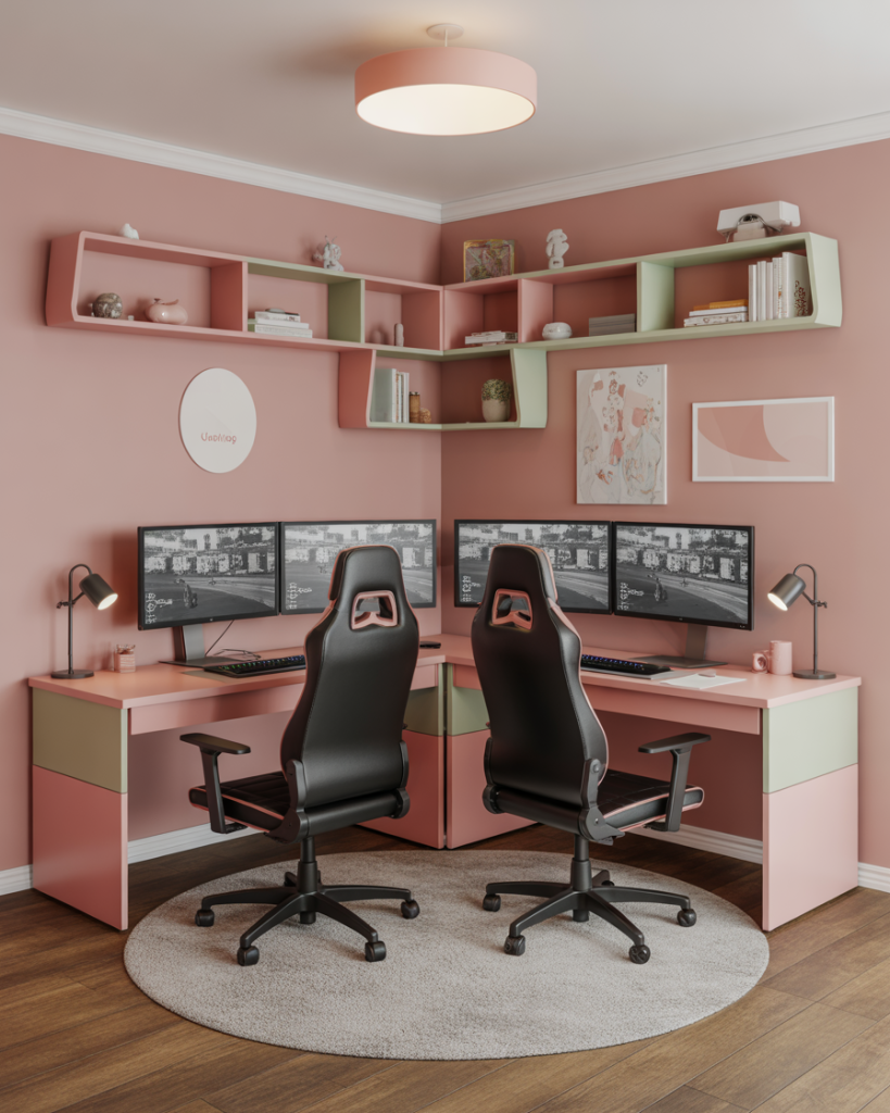 Soft pink, lavender, and blue hues create a gentle aesthetic perfect for couples. Dual desks with matching chairs make this setup functional for both gaming and work. Decorative touches like neon hearts or cozy rugs turn it into an affordable couples paradise. It’s playful, romantic, and practical, especially in shared bedrooms where style matters.