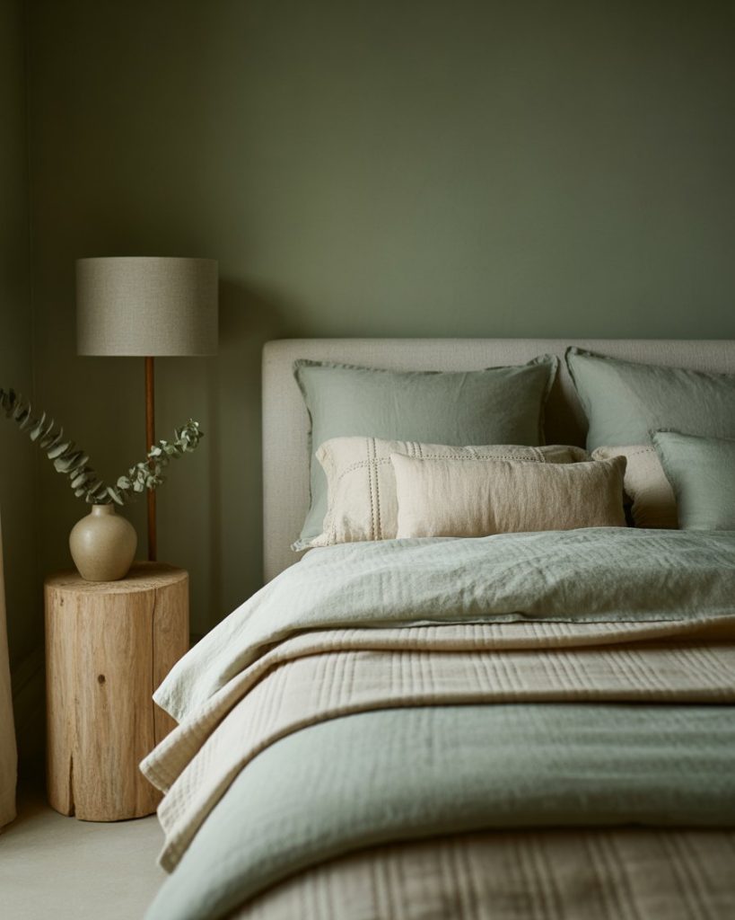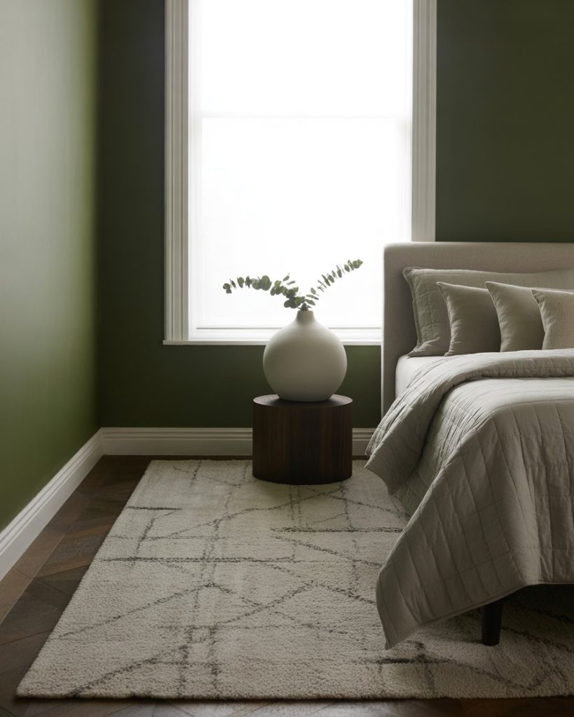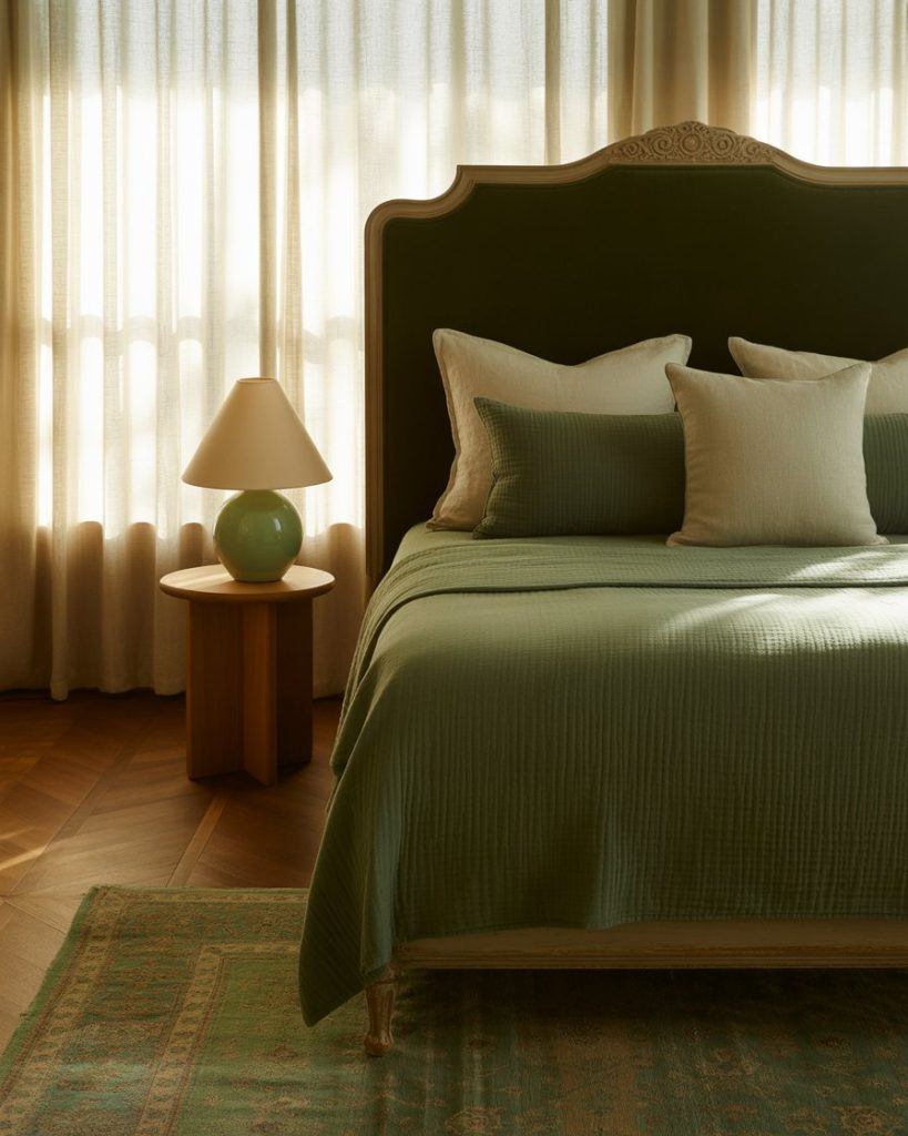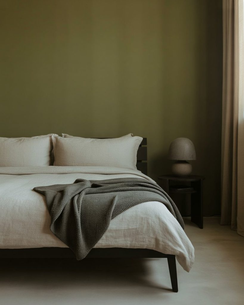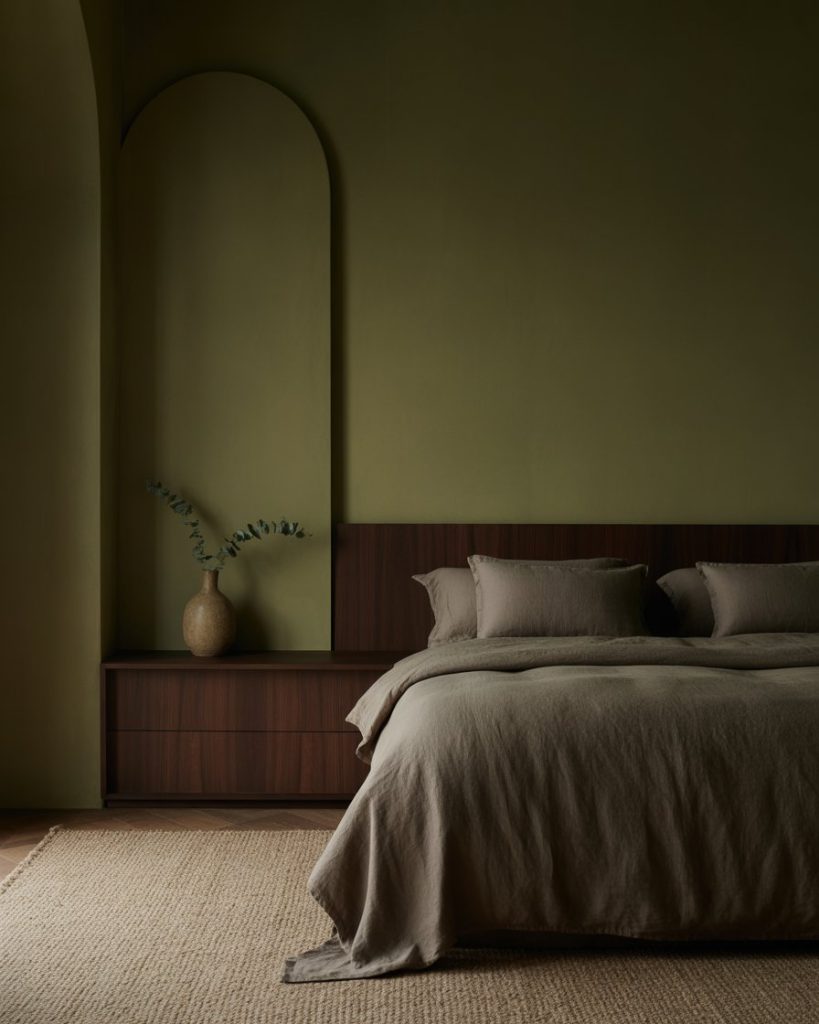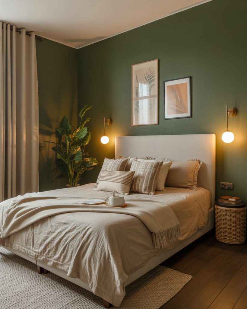 Blending olive walls with beige and natural wood creates a timeless soft bedroom. The combination feels restful yet earthy—perfect for those who want a grounded aesthetic without being too dark. Add linen bedding, neutral curtains, and ceramic lamps for texture. According to designer Shea McGee, olive pairs beautifully with creamy tones that highlight its warmth.