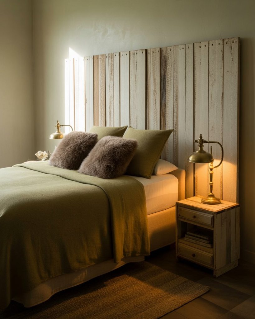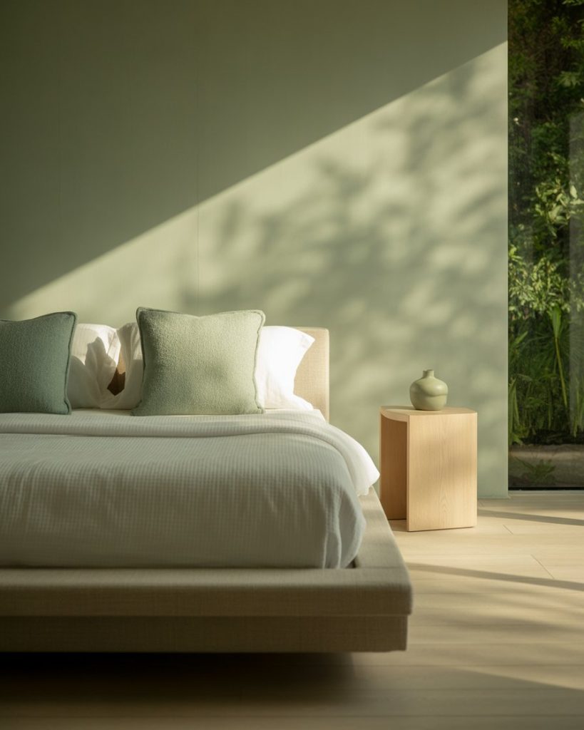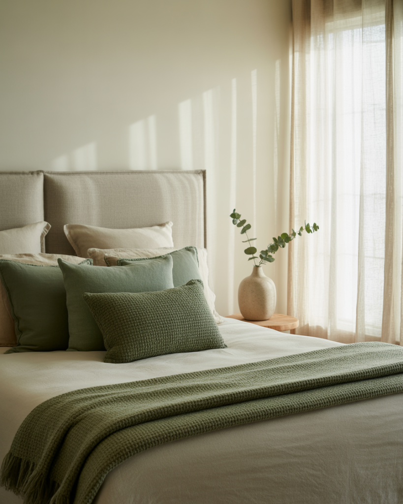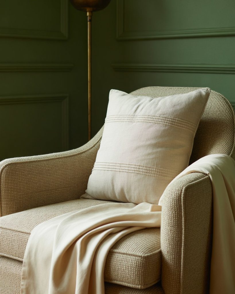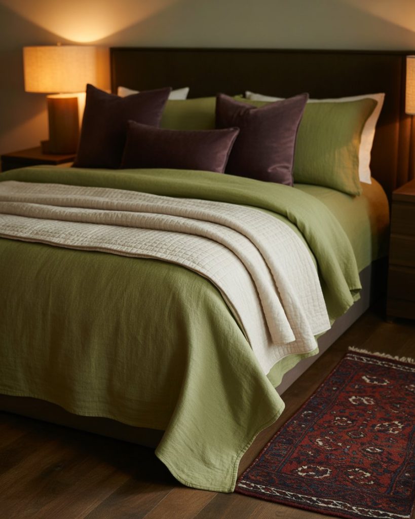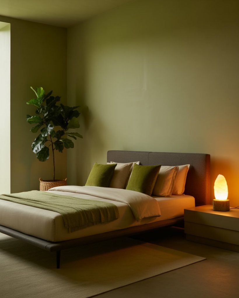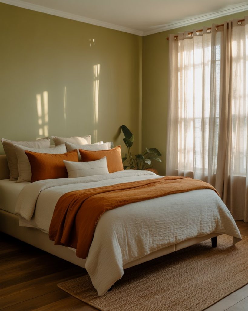 Blending olive walls with beige and natural wood creates a timeless soft bedroom. The combination feels restful yet earthy—perfect for those who want a grounded aesthetic without being too dark. Add linen bedding, neutral curtains, and ceramic lamps for texture. According to designer Shea McGee, olive pairs beautifully with creamy tones that highlight its warmth.