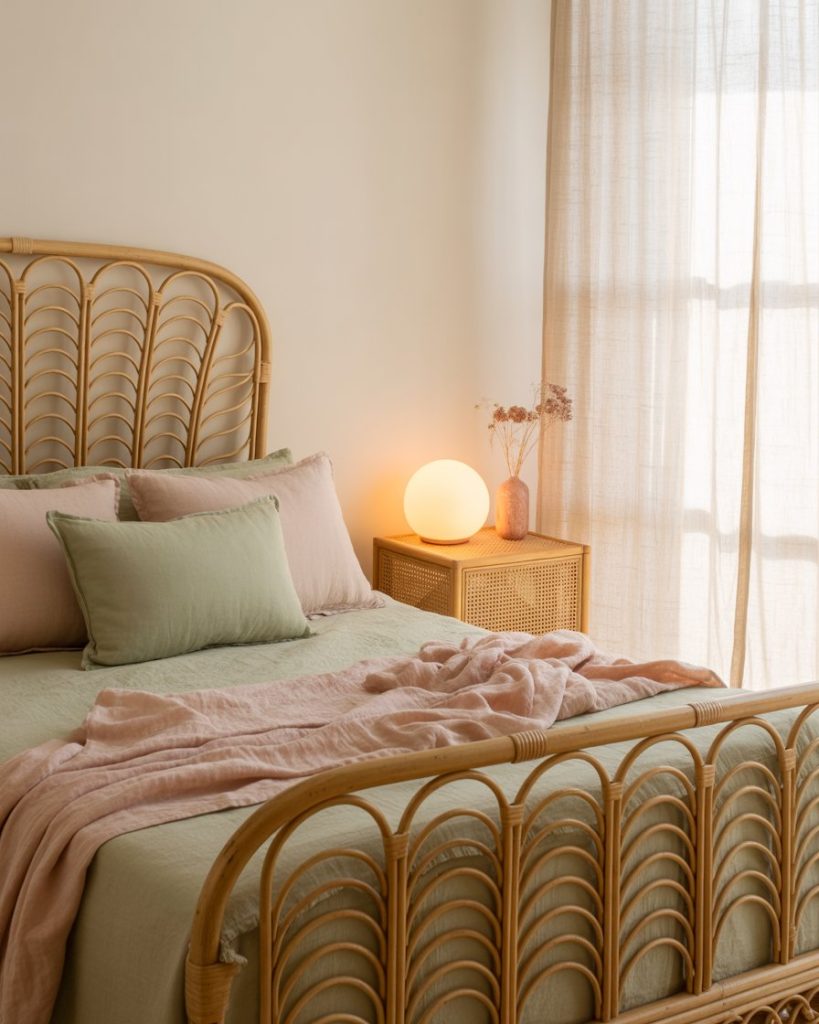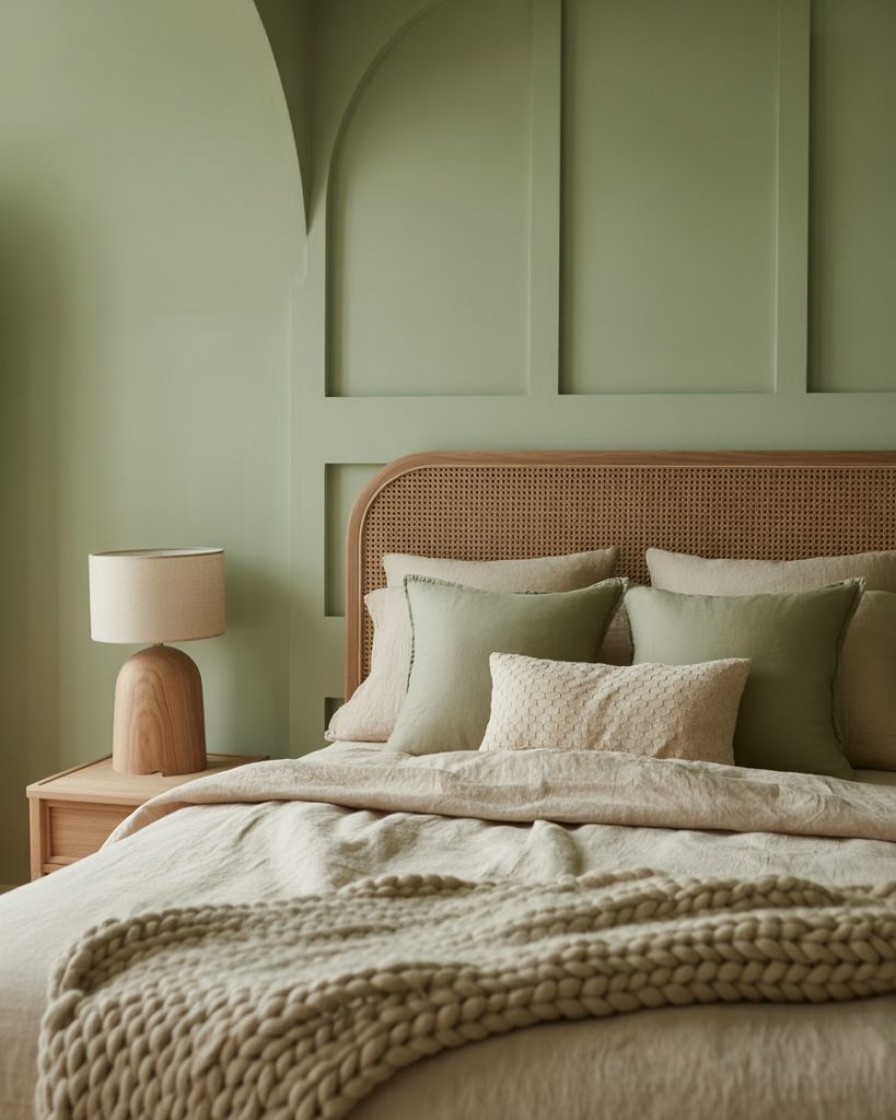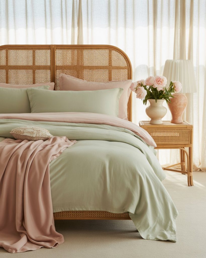 Soft pastel greens paired with pink and rose hues bring romance to modern bedrooms. This gentle color combo feels youthful but refined. Influencers on The Everygirl highlight pastel green as a top trend for its ability to refresh classic feminine palettes. Add a rattan bed frame and blush art prints for subtle warmth.