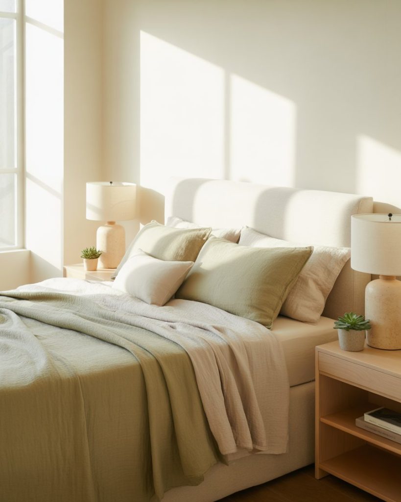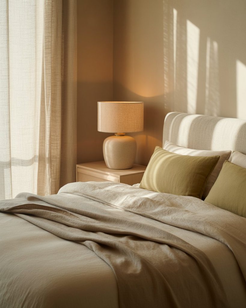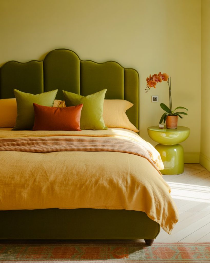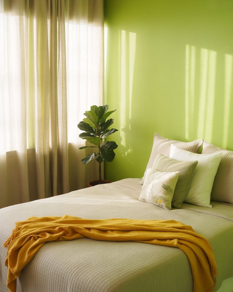 Bring joy to your mornings with a blend of lime and beige and tones. Lime pillows, lamps, or artwork add energy, while beige bedding keeps it warm and balanced. Design experts at MyDomaine say this combo brings “color therapy” into everyday living spaces. It’s cheerful yet sophisticated, especially when used with natural textures.