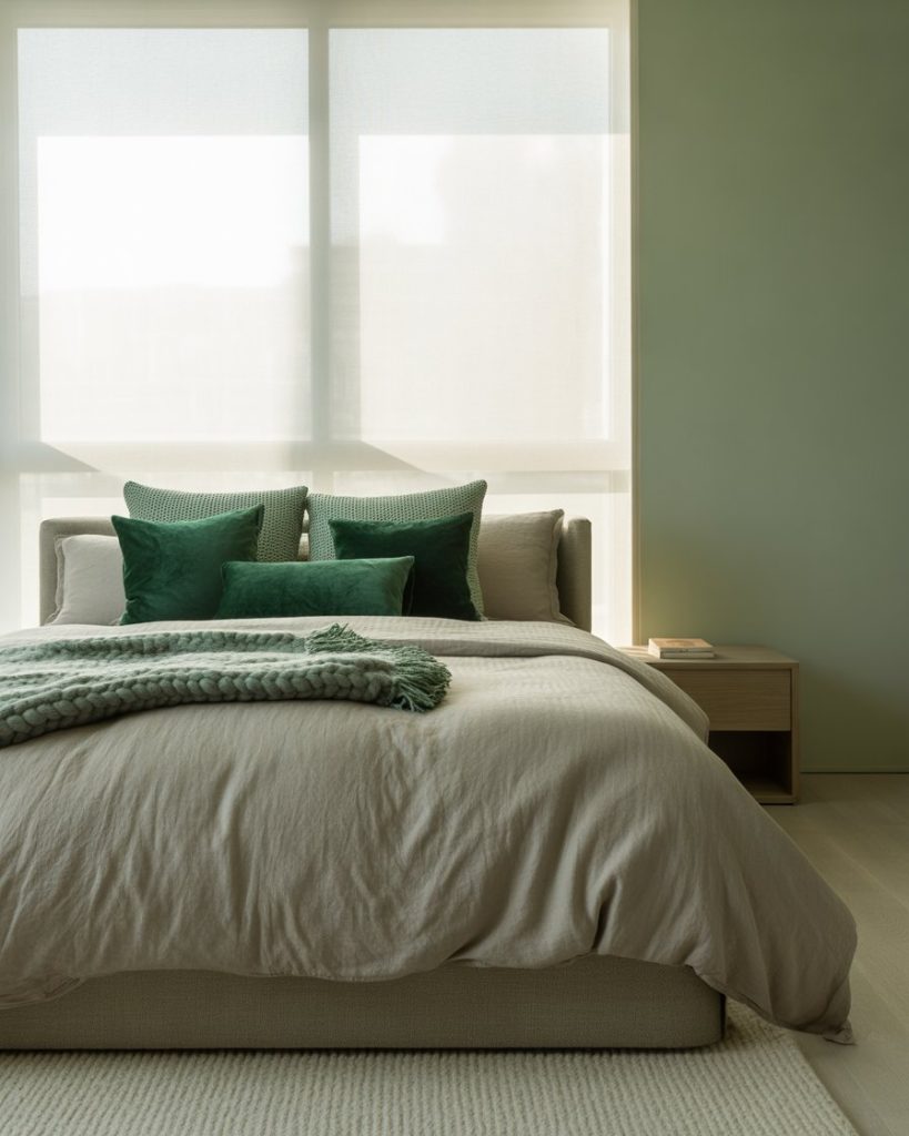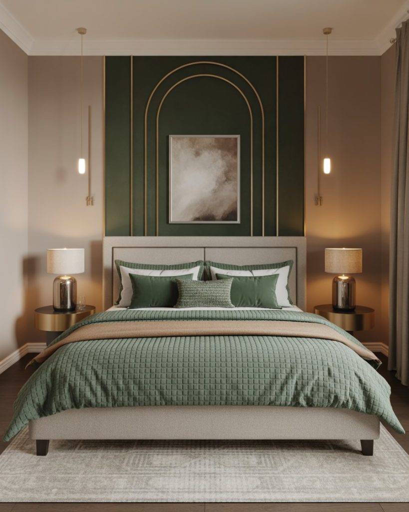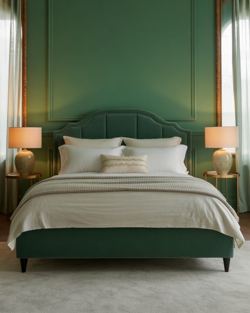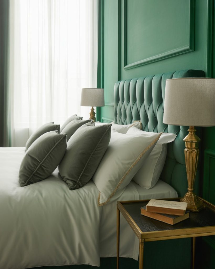 For lovers of contrast, dark green walls balanced with gray and accents create sophistication without gloom. Use a gray upholstered bed, dark green throw,and white and accessories for brightness. Designers note that gray softens bold greens and creates harmony between classic and contemporary. Ideal for urban homes with modern taste.