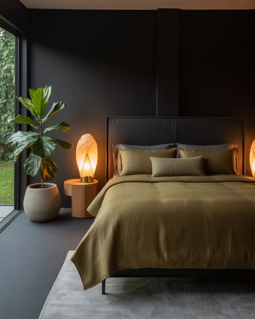 For bold minimalists, mix olive with black and accents for a sleek, contemporary style. Black lamps or picture frames ground the look while olive walls add subtle softness. The contrast creates high visual interest but remains elegant. This design feels gender-neutral and modern — perfect for lofts or city apartments.