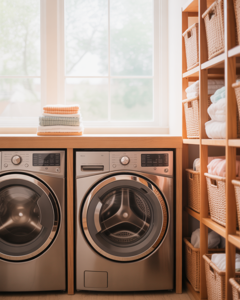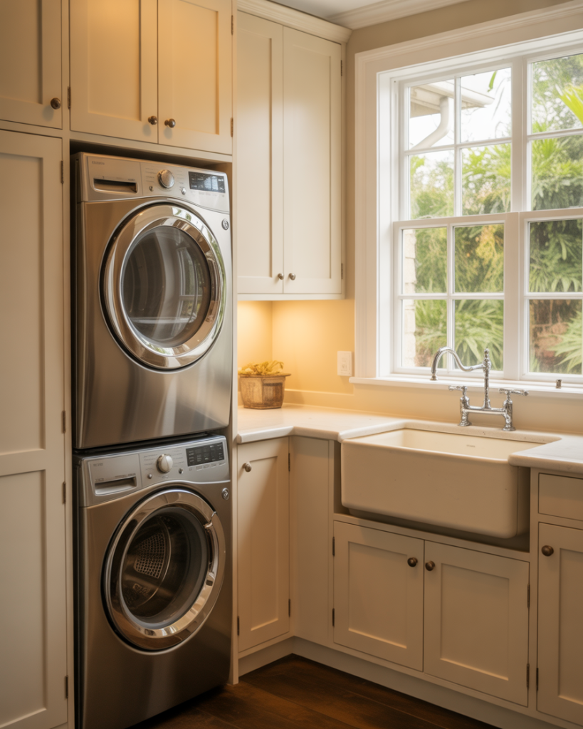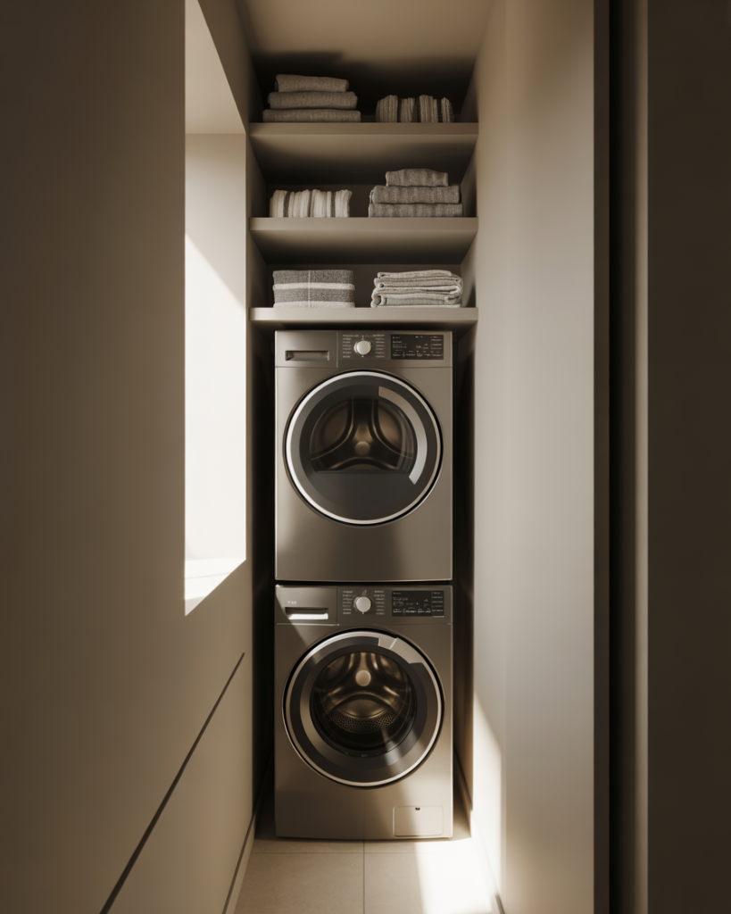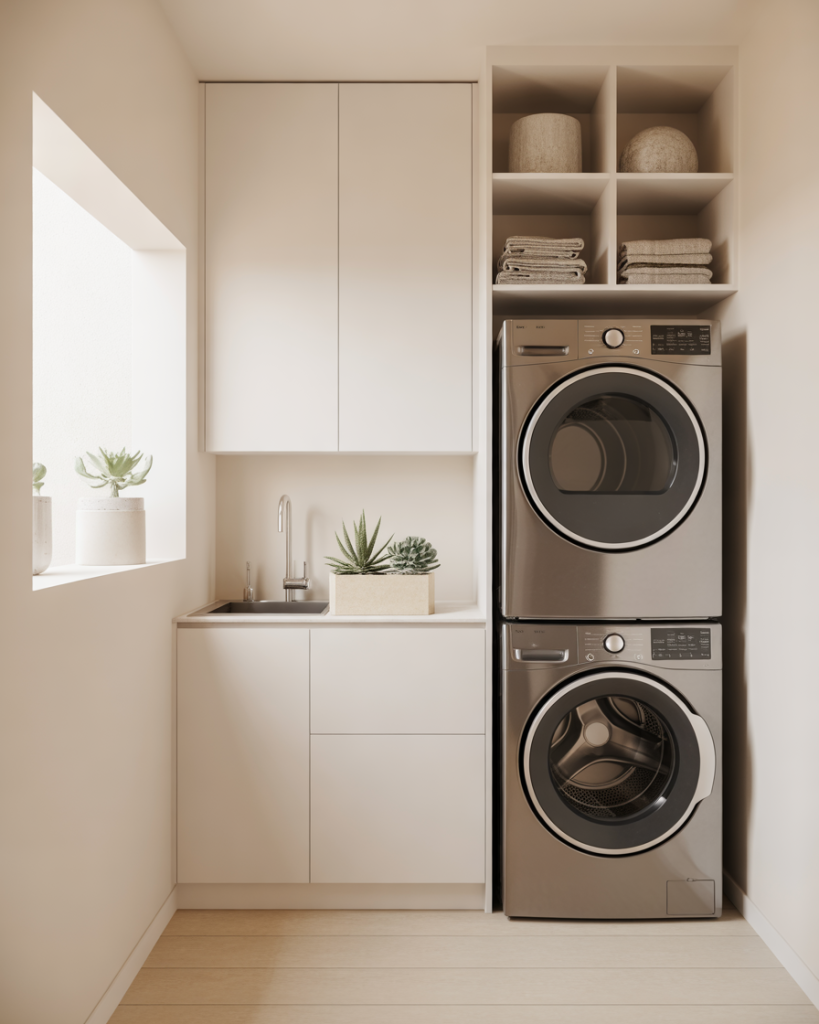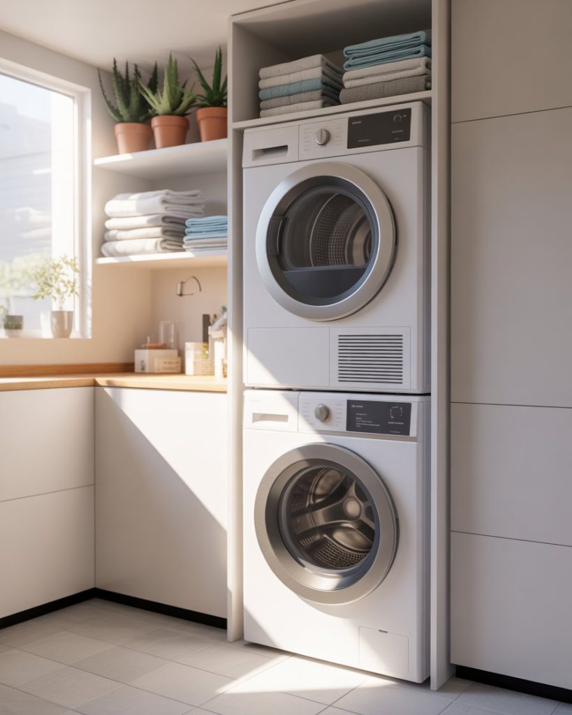 Using stackable washer and dryer units is the ultimate stackable space saving hack for small laundry rooms. By arranging stackable machines vertically, you free up valuable floor space for shelves, a sink, or cabinets. Many people in 2026 opt for a stacked washer in compact apartment settings, inspired by clever layouts you’d even see in Bloxburg builds. It’s a smart way to stay on a budget while gaining extra storage and efficiency.