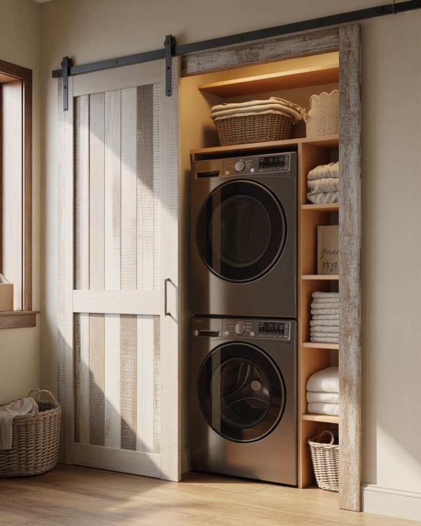 Installing a sliding barn door is a super practical way to hide your laundry area in plain sight. This design works well in an apartment or small home where you want to maintain style without sacrificing organization. Behind the door, you can fit stackable machines and shelves for detergents. A barn door adds rustic flair and saves space compared to a swinging door, which can clutter a tight hallway.