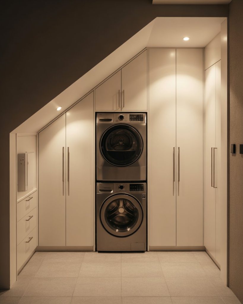 Many homeowners in 2026 are transforming the area under staircases into a hidden laundry zone. By fitting front loaders or even an in one washer dryer unit, this overlooked space becomes a highly efficient corner. Add cabinets for organization storage space saving and maybe a small sink nearby if plumbing allows. This idea maximizes every inch while keeping the laundry out of sight.
