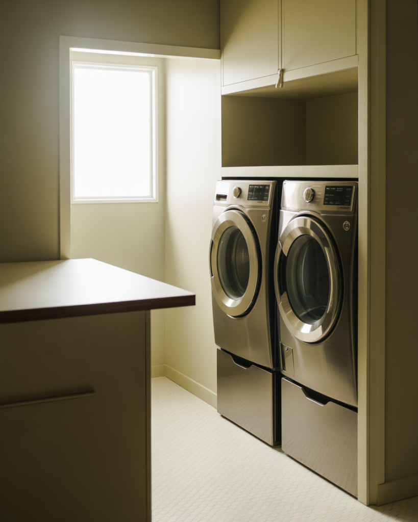 Choosing front loaders allows you to install a folding table directly on top, creating double-duty functionality. This setup is praised by designers as one of the most organization storage space saving solutions for 2026. The table also works as a station for baskets, cleaning products, or even an extra prep surface in a small home. In tight spaces, this small addition makes laundry more efficient and stress-free.