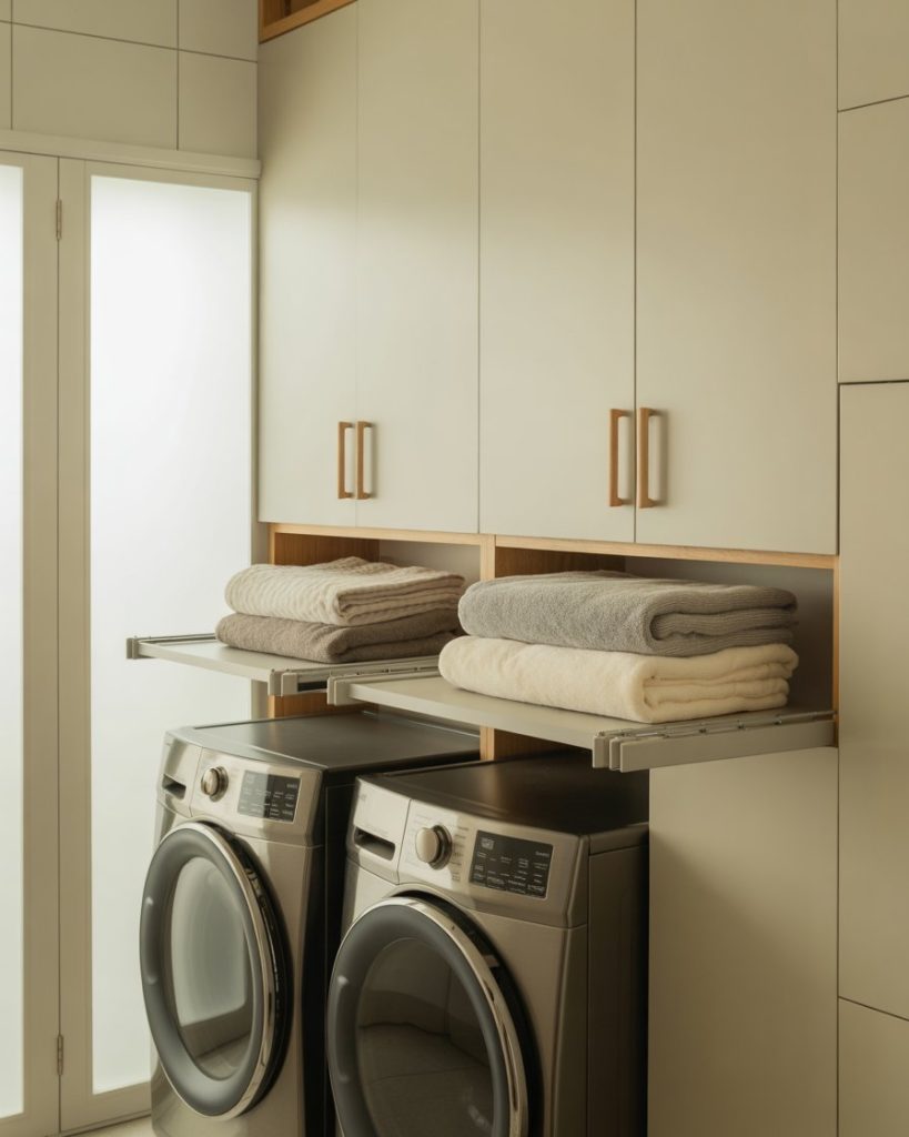 Adding pull-out or fold-down drying racks is a super clever way to dry delicate clothes without taking up floor space. These racks fit perfectly above a front loaders setup or beside a utility sink. They slide back when not in use, making them ideal for an apartment. Designers highlight them as a favorite 2026 innovation for organization and space saving.