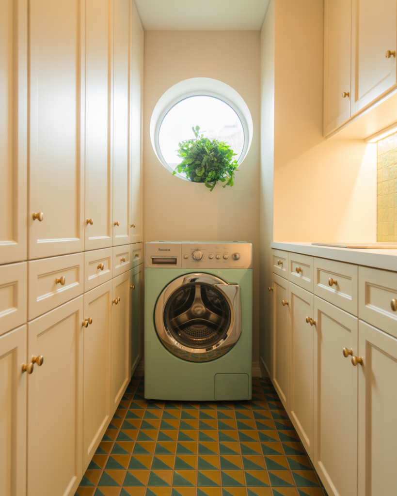 If you don’t want wallpaper, patterned flooring is another great way to add character. A small laundry room with colorful tiles feels super vibrant, even if all you have is a top loading washer and some cabinets. The contrast of playful floors with simple organization details like shelves makes the room both stylish and functional.