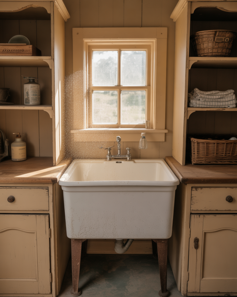 Adding a utility sink is a game-changer in small spaces. A farmhouse-style sink layout offers both charm and functionality, letting you handle messy jobs, delicate handwashing, or soaking laundry with ease. This trend works with both top loaders and front loaders, giving your laundry corner a rustic, homely vibe. Pair the sink with vintage-inspired cabinets for a cozy touch that makes the area feel like more than just a workspace.