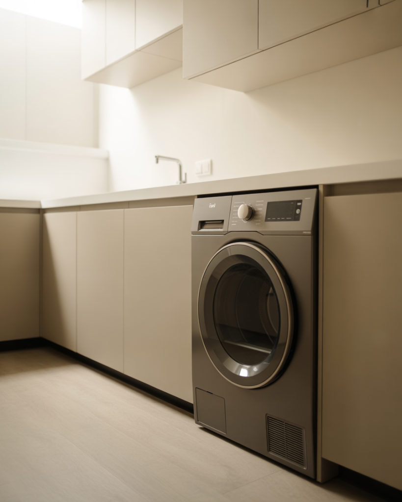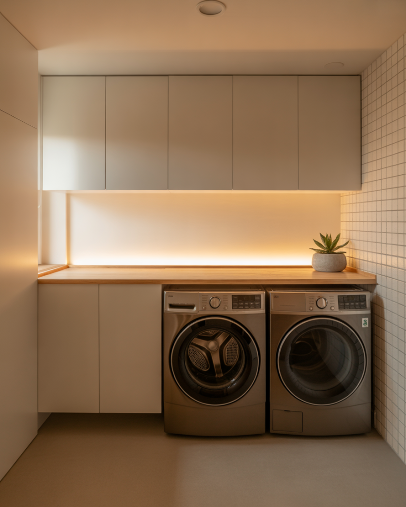 Another clever 2026 trick is hiding a folding table inside wall cabinets. Pull it down only when needed, then tuck it away for extra space. This works beautifully with front loaders or in one washer dryer setups. It’s a very smart solution for apartment living where every inch counts and organization storage space saving is essential.