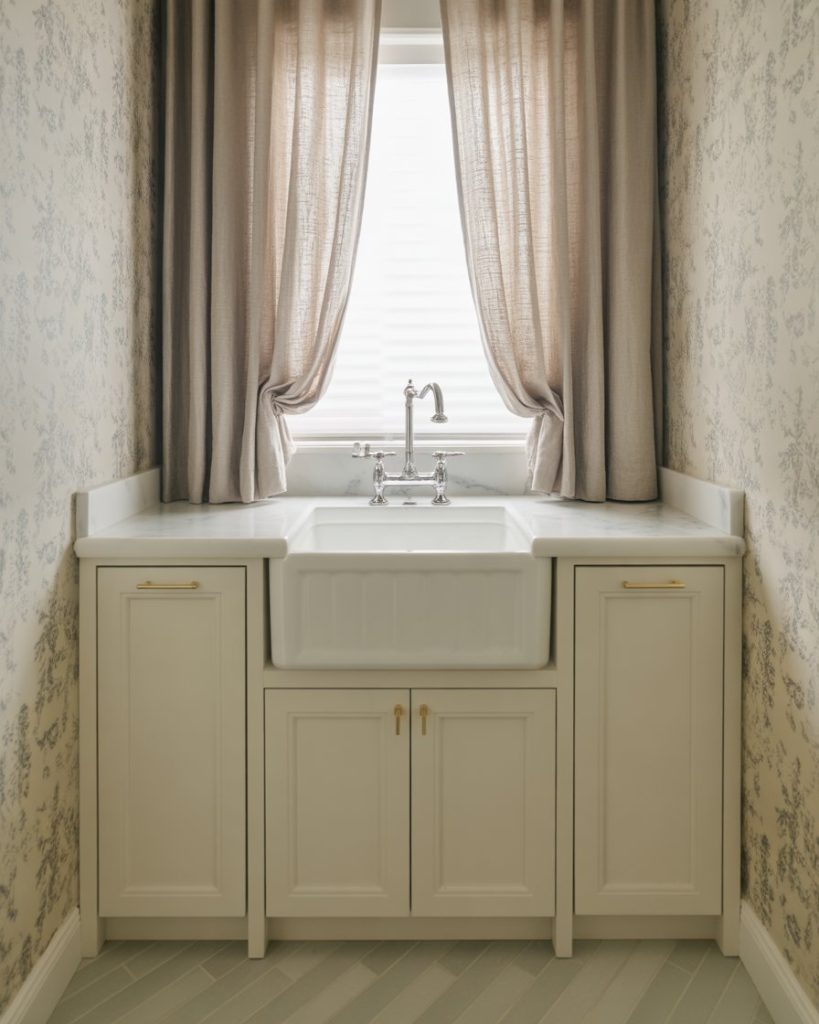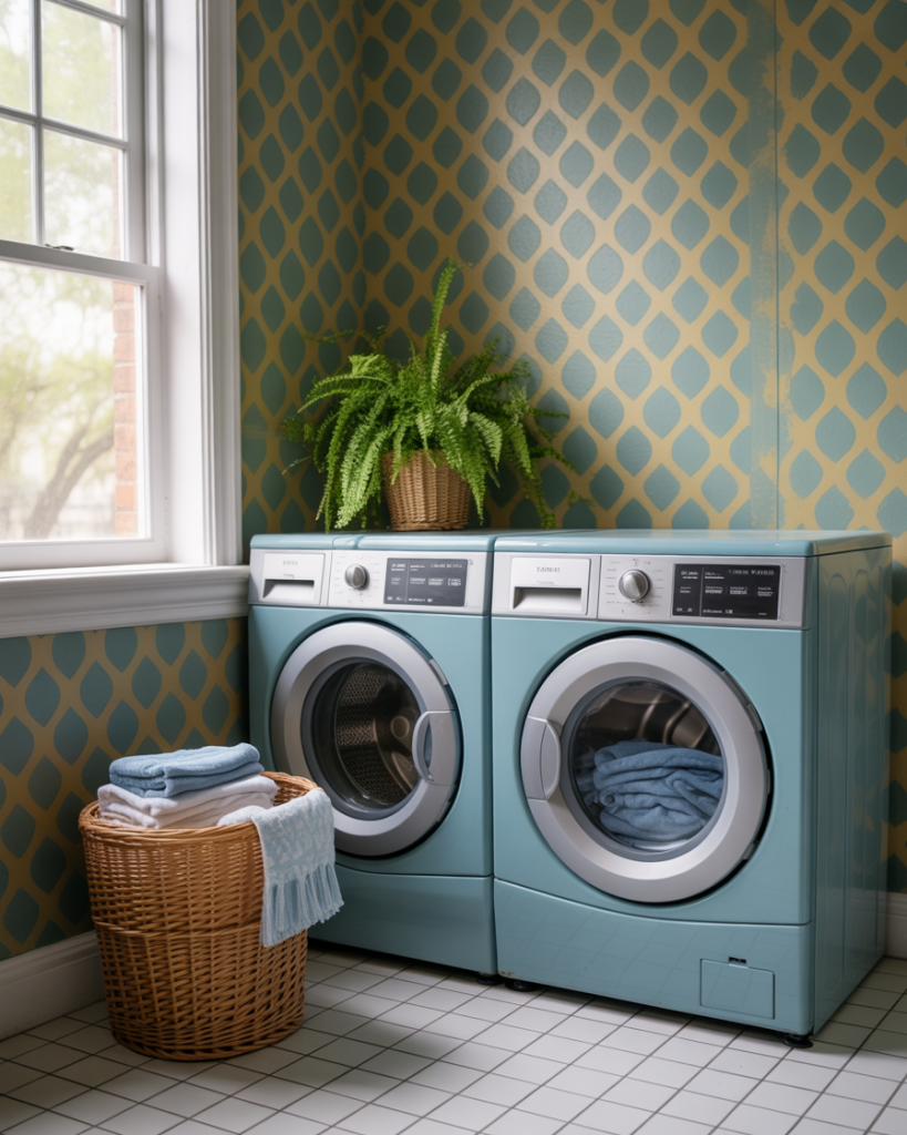 Even if your space is small, bold wallpaper can transform it. Designers say this super popular trend will stay strong through 2026, bringing color and energy to the laundry area. Pair bright patterns with clean cabinets and a simple sink layout to balance fun with practicality. Wallpaper is an easy, budget-friendly way to make laundry day feel less like a chore.