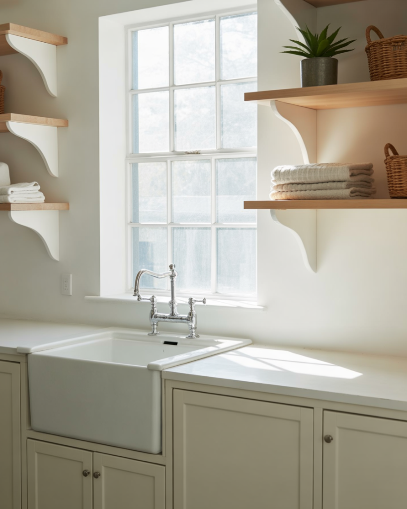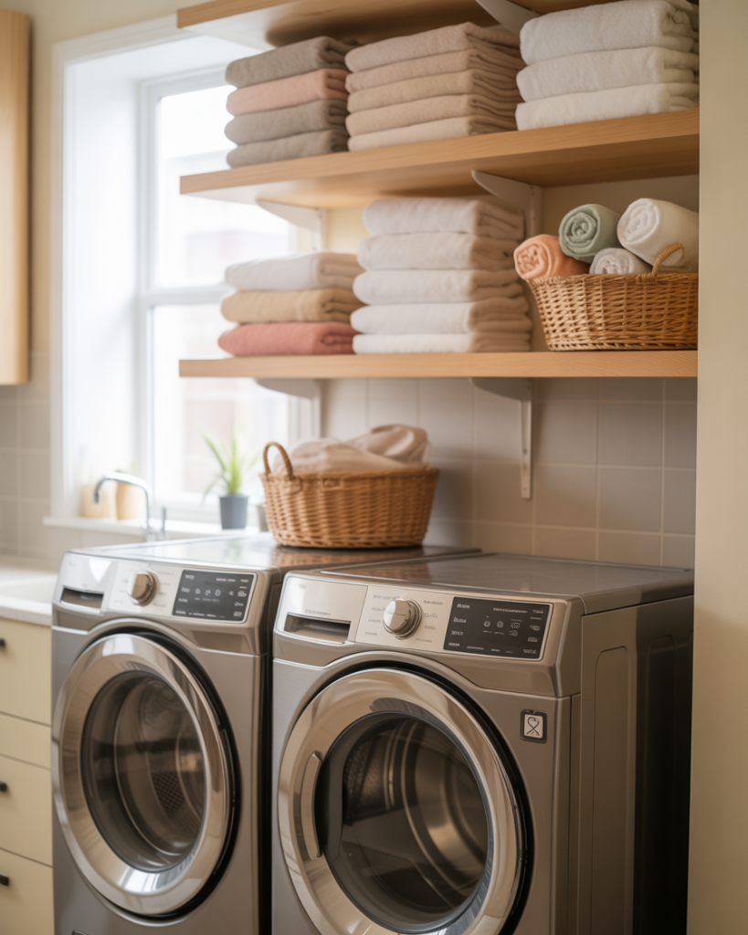 Never underestimate the power of shelves and cabinets in a laundry room. By going vertical, you can maximize organization storage space saving in even the tiniest corner. Floating shelves can hold jars of detergent, while cabinets keep clutter hidden. Combine this setup with stackable machines or a utility sink to get both style and efficiency without wasting square footage.