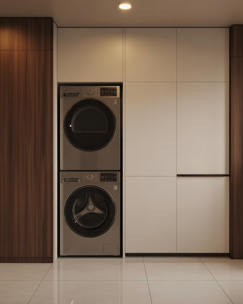 In many apartment designs, the laundry is cleverly hidden behind cabinets or sliding panels. This design trend emphasizes organization storage space saving while keeping the room stylish. Whether you use a stackable set or an in one washer dryer, concealing them makes your living area feel cleaner and more open. This idea is super practical and a favorite among city dwellers in 2026.
