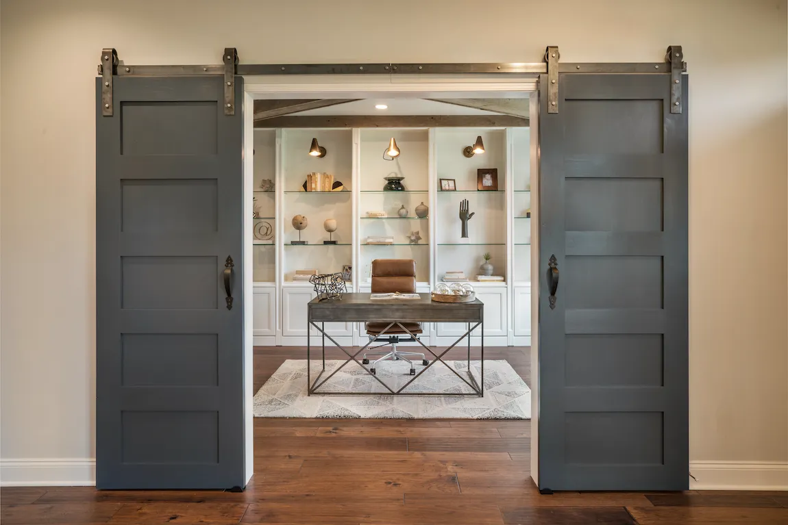 19. Sage Green Bungalow with Red Doors and Minimalist Lighting