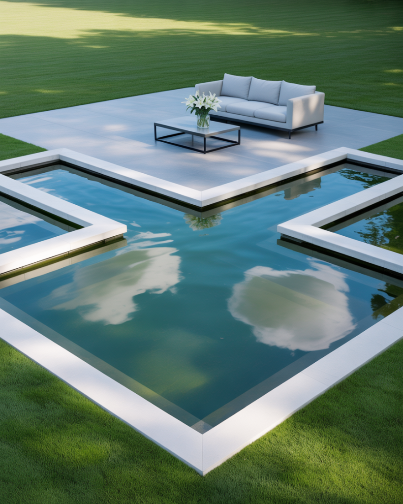 For a bold graphic touch, a black and white geometric pond creates instant drama. Using angular lines, monochrome tiles, and reflective water, this design suits industrial or modern homes. A colleague once added checkerboard tiles to his pond, and it became the centerpiece of his backyard. The dark tones balance with light edges, making it both sharp and elegant.