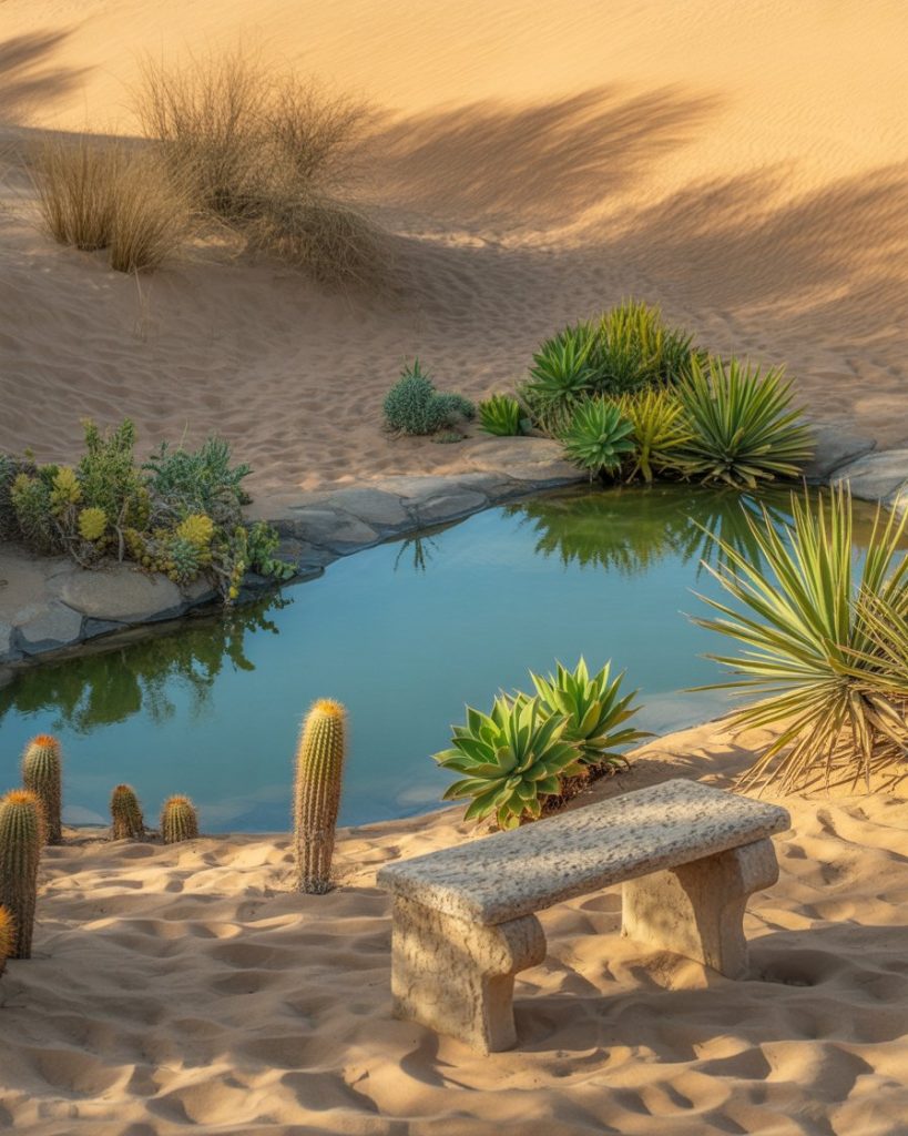 Even in dry landscapes, a pond can thrive as a striking focal point. Surrounded by cacti, succulents, and sandy textures, a desert pond feels dramatic and unexpected. The contrast of water against earthy tones makes it unforgettable. I once encountered one in Arizona where tall agaves reflected in the water under a blue sky, creating a surreal calmness. It’s a design for those who value bold statements.
