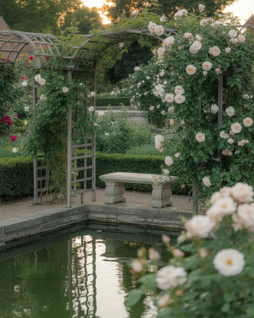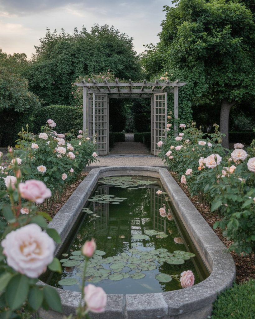 Pairing a pond with a rose garden creates pure romance. Imagine water surrounded by climbing roses, trellises, and gentle lighting. The style leans French, drawing from historic gardens that embrace symmetry and beauty. I remember attending a wedding where the pond reflected red roses, making the entire scene unforgettable. This idea is perfect for those who value elegance and tenderness.