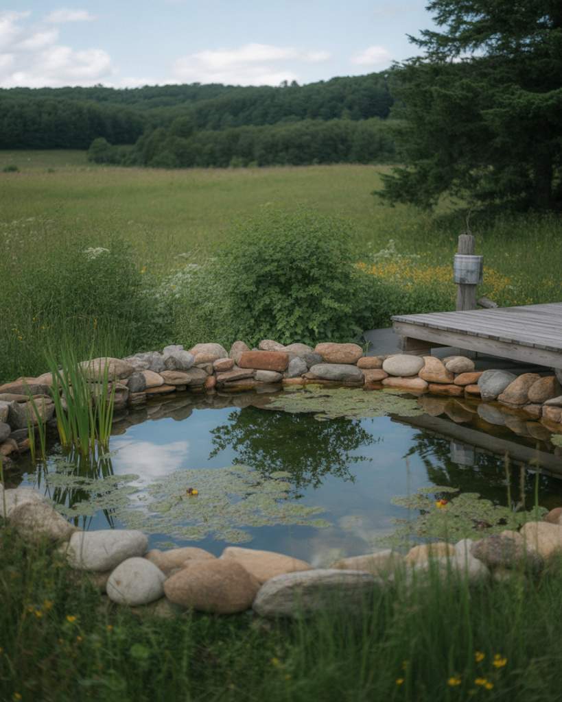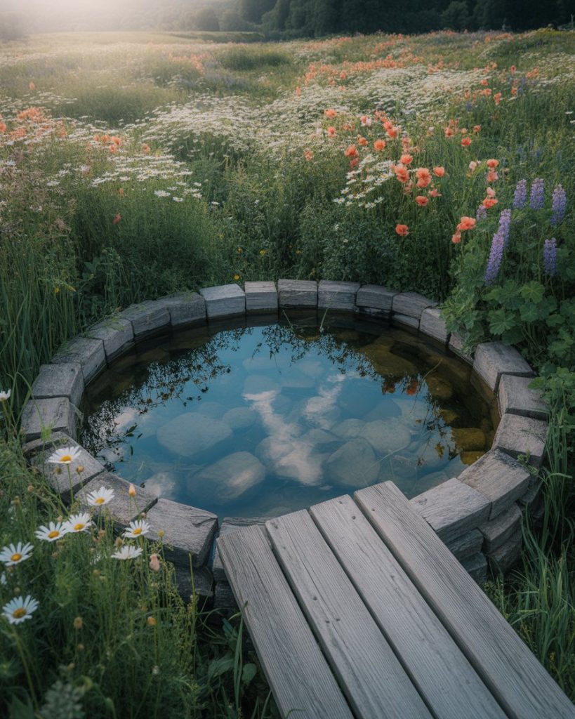 A rustic pond carries the essence of old farm charm. Using natural stones, reclaimed wood decks, and wildflower edges, this idea celebrates imperfection. It pairs beautifully with country aesthetics, reminding me of the ponds I used to see on my grandparents’ property. The gentle sound of frogs at night or dragonflies dancing across the water connects you to nature instantly. This is perfect for homeowners who love low-maintenance yet character-rich landscapes.