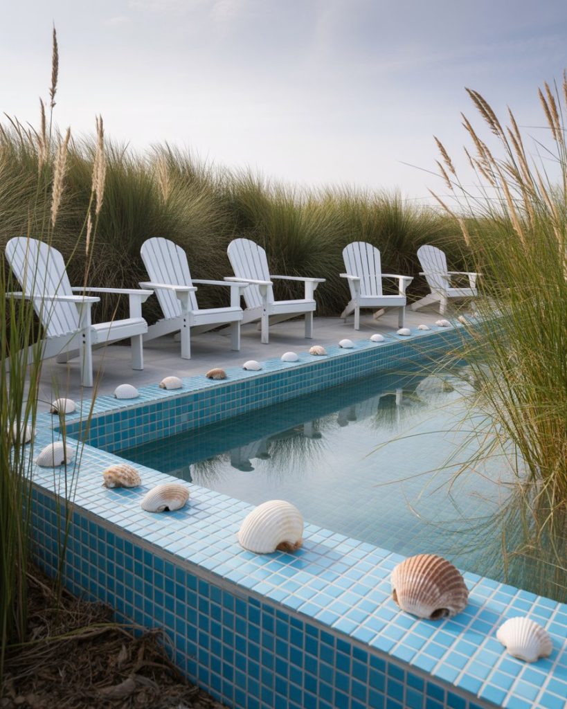 A coastal pond brings the ocean inland with blue tiles, seashell accents, and dune grasses along the edge. It’s breezy, light, and relaxing. I once visited a beach house in the Carolinas where the pond reflected the sky, making it feel like an extension of the sea. Pair with driftwood seating or white Adirondack chairs for the perfect finish. This style is ideal for those who dream of the beach even when they’re miles away.