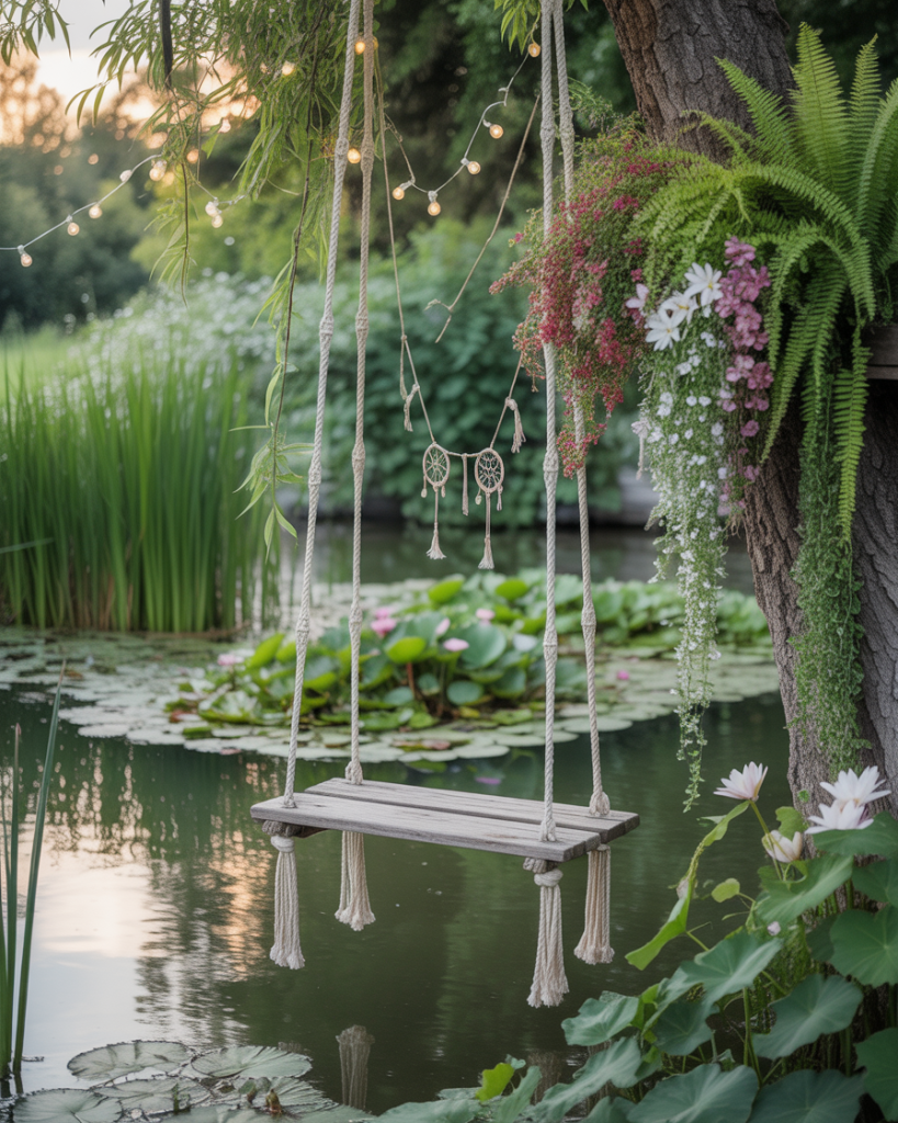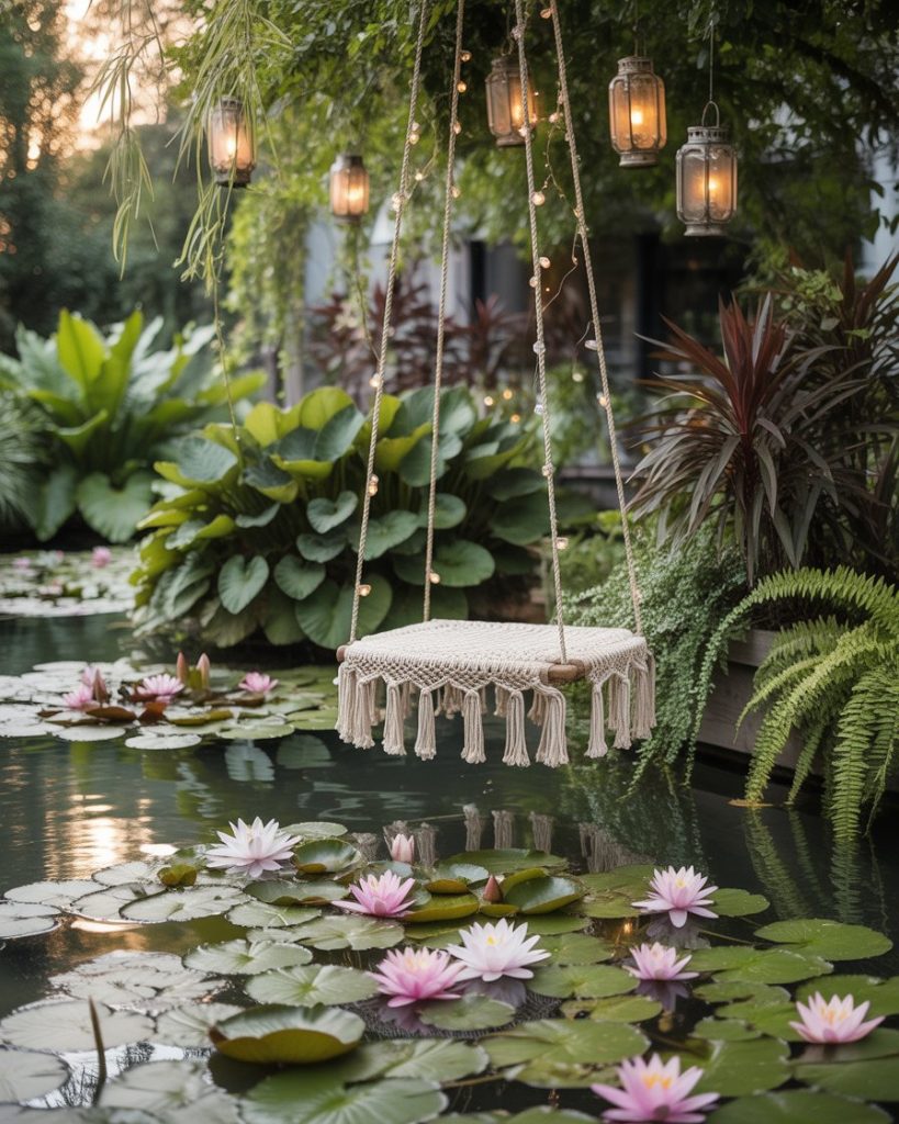 A boho pond celebrates freedom and layering. Add vibrant plants, macramé swings nearby, and scattered lanterns for an eclectic look. Bohemian styling encourages creativity: place water lilies, mix textures, and don’t shy away from color. I once added bright koi to a friend’s pond, instantly making it feel alive and artistic. This design is great for those who want their backyard pond to feel like a story in progress rather than a finished masterpiece.