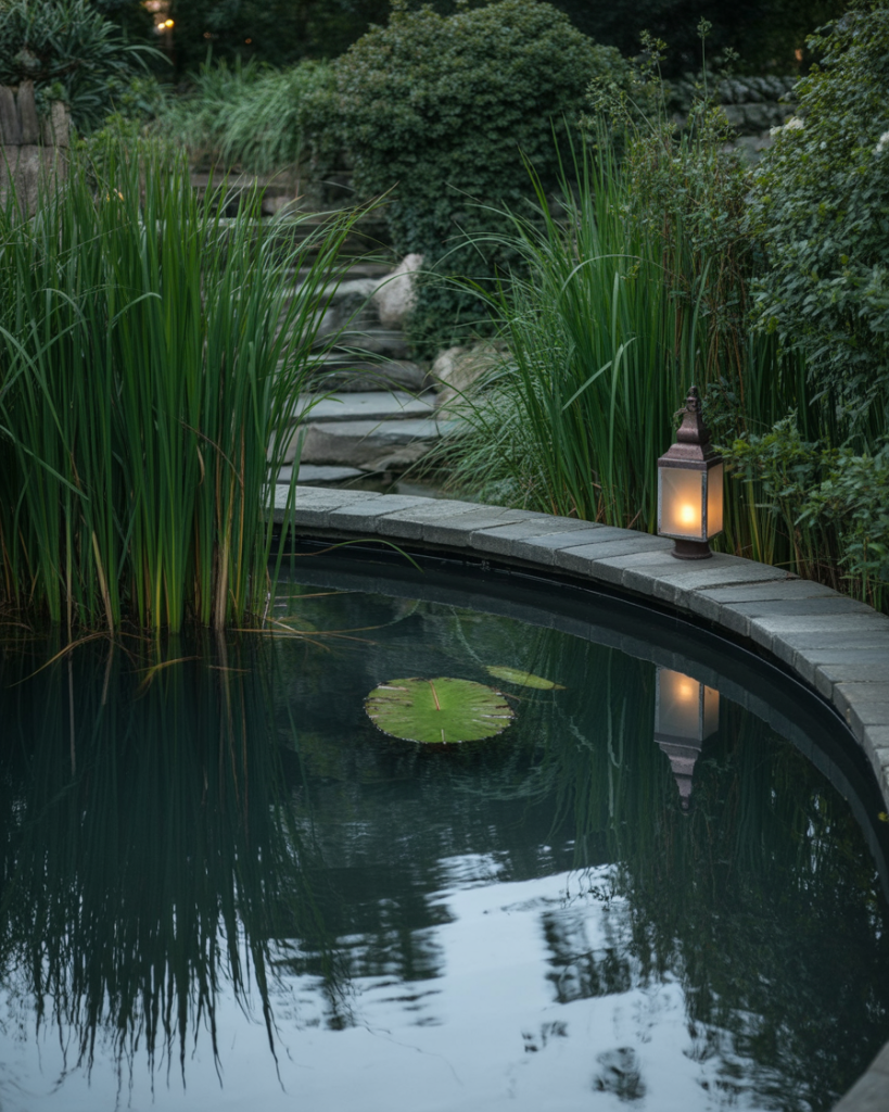 A moody pond uses shadows and tone to create an atmospheric retreat. Dark water surfaces, tall grasses, and subtle lighting add depth. The design often plays with black stone or reflective finishes, which can make even smaller spaces feel infinite. I once saw a moody pond framed with lanterns that gave it a cinematic, unforgettable vibe. It’s ideal for people who prefer mystery over cheerfulness in design.