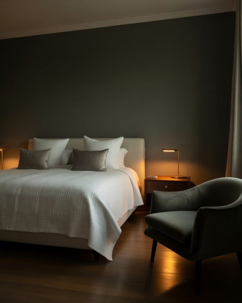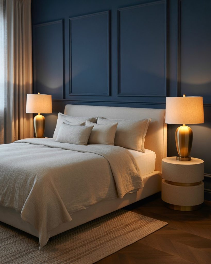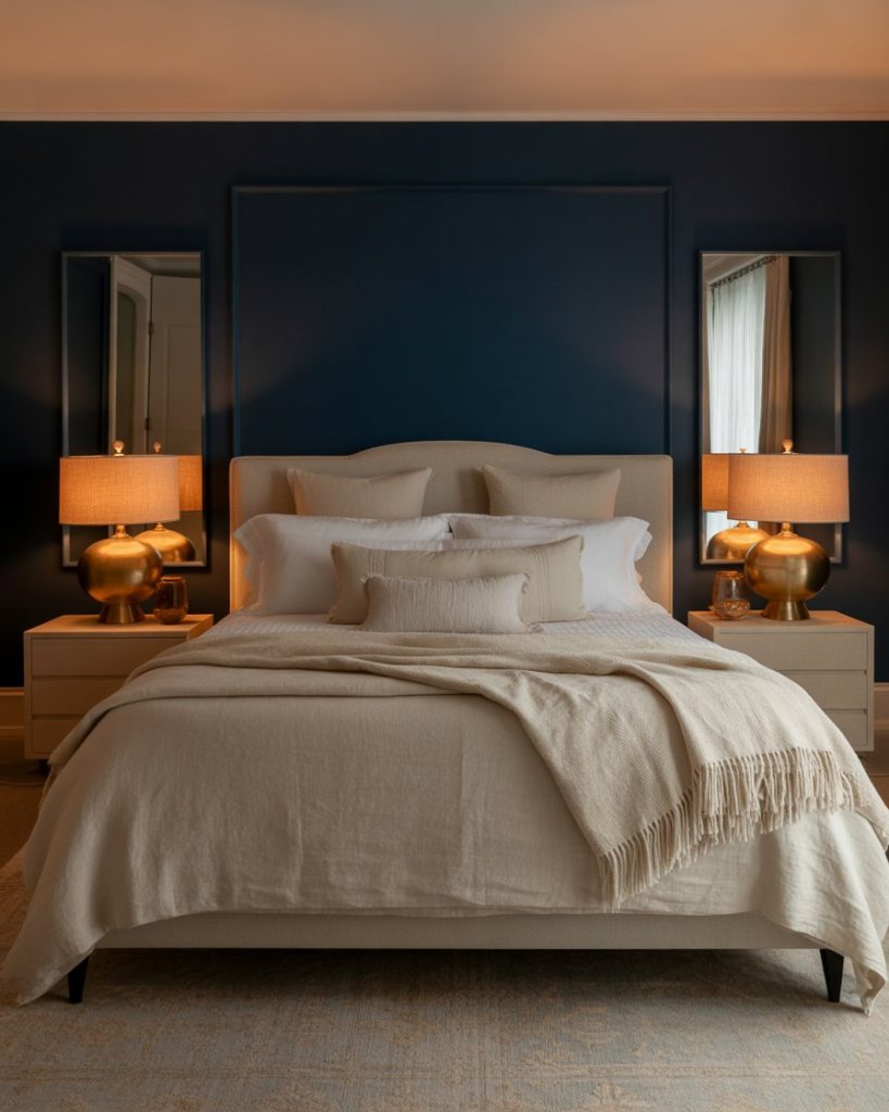 The juxtaposition of a navy or dark wall with neutrals generates all the ambiance for that cozy, modern touch of luxury. The contrast itself is calming, endowed with an air of sophistication on linen bedding and glowing down-lit ambiance. Some brass-toned lamps and golden frames could cast warmth across the dark side-the two-way dichotomy of deep calm has become designers’ favorite across an update to that timeless presence of a modern bedroom.