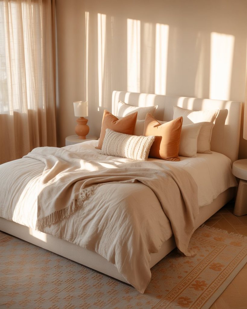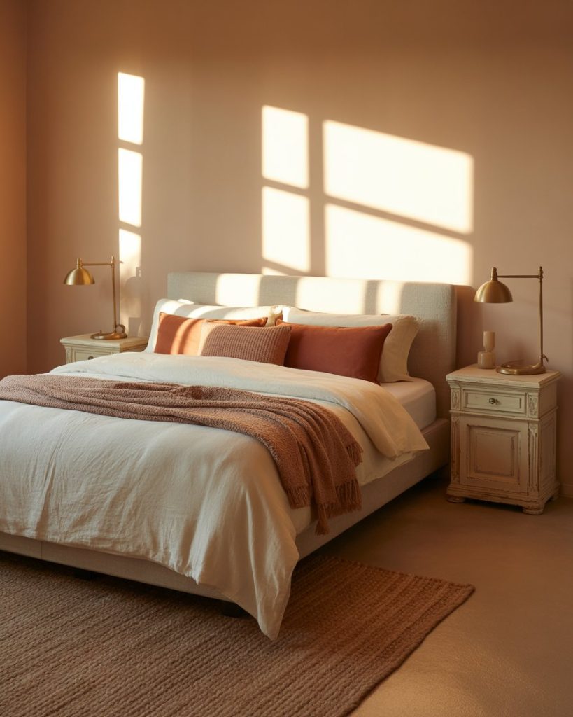 Get your bedroom nice with warm terracotta shades for that cocoon ambience. Terracotta is so mighty, that whether it’s clay walls, funky pottery, or woven terracotta rugs, your room will flash some Mediterranean vibes and still feel so modern. Ivory linen and light oak or rustic wood furniture will balance out the richness. This wonderful earthy palette is capable of absorbing sunlight and allowing it to breathe in peaceful silence.
