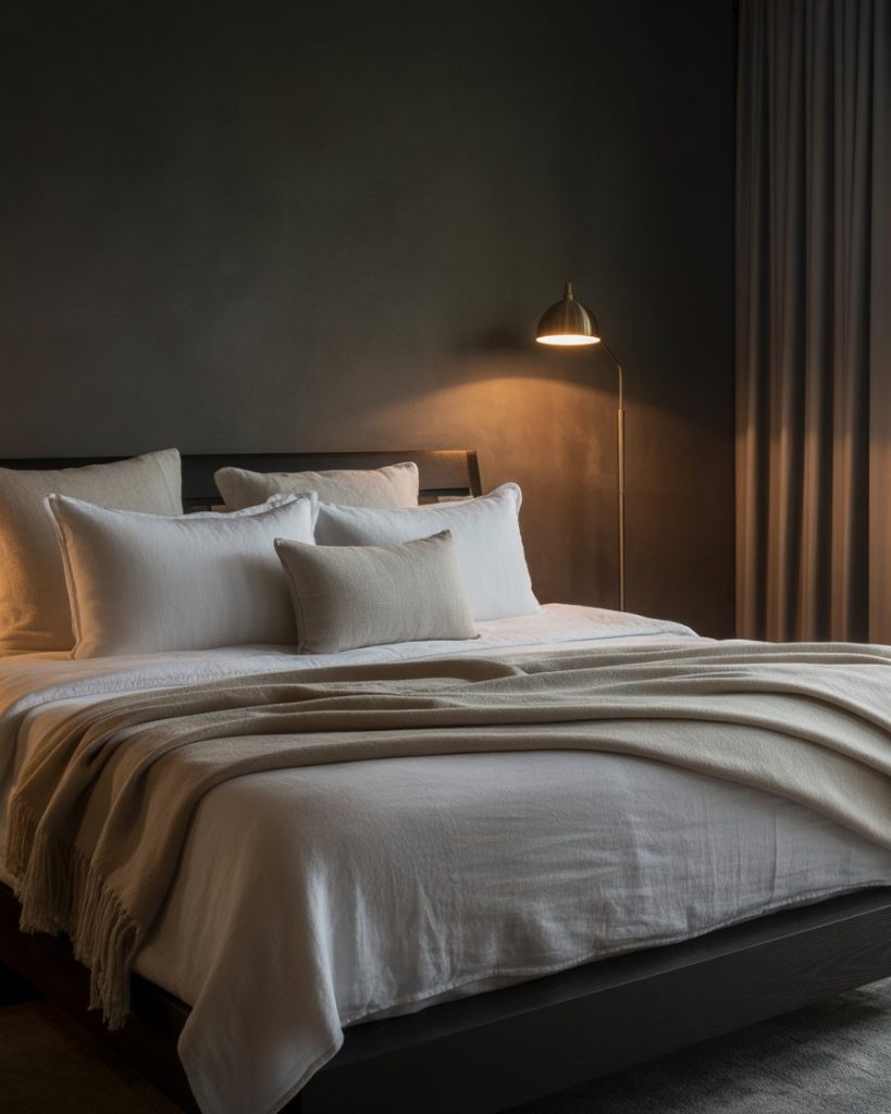 Moody charcoal palette yields dramatic sophistication while retaining calmness. Paint the walls deep grey and contrast with bright white bedding. Soft lighting and warm textures retain the familiar feeling and eliminate any coldness. Throw in some modern touches like geometric lamps or a few pieces of framed abstract art to strike a fine balance between class and fun. This look is suitable for both den apartments and suburban retreats.