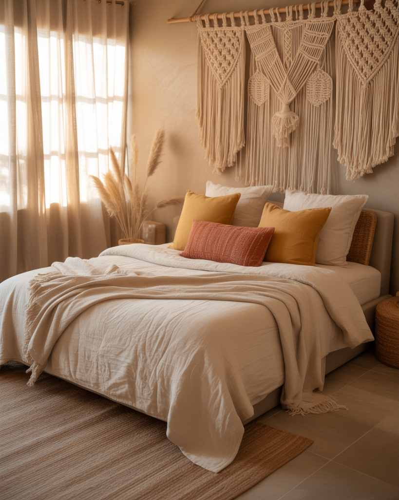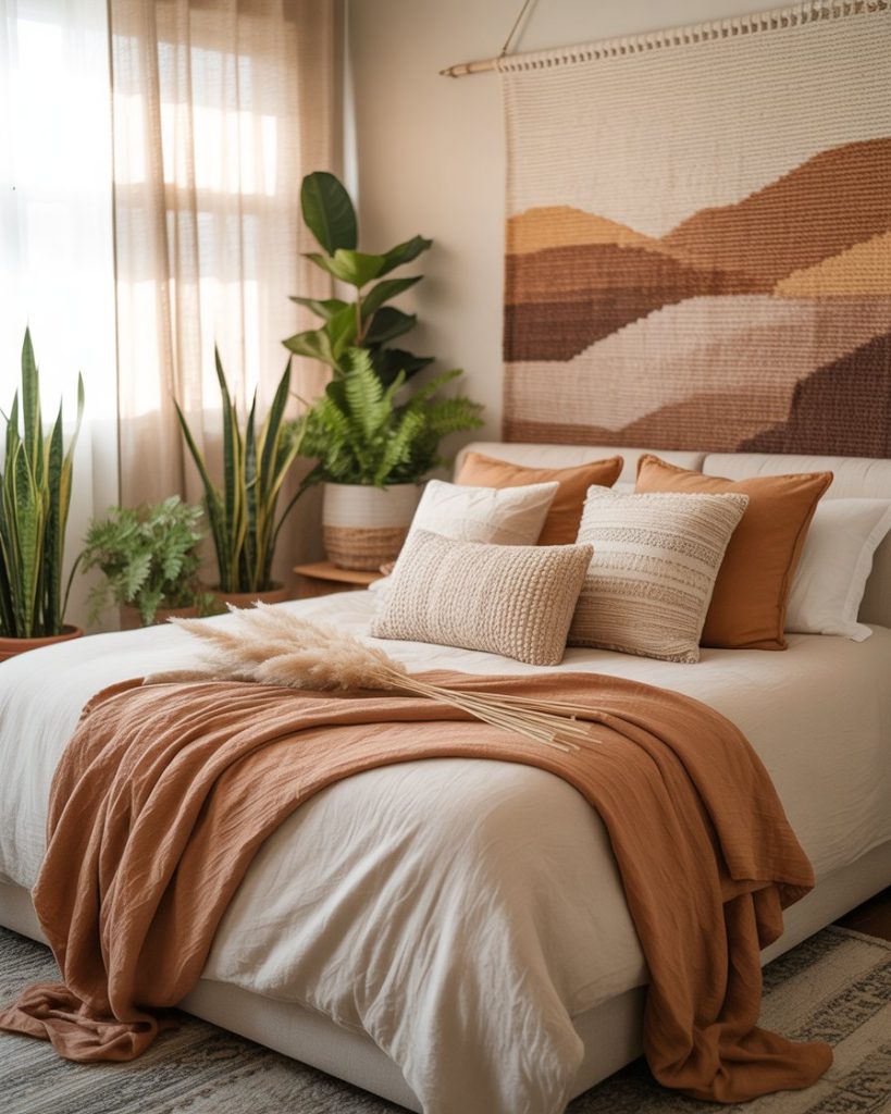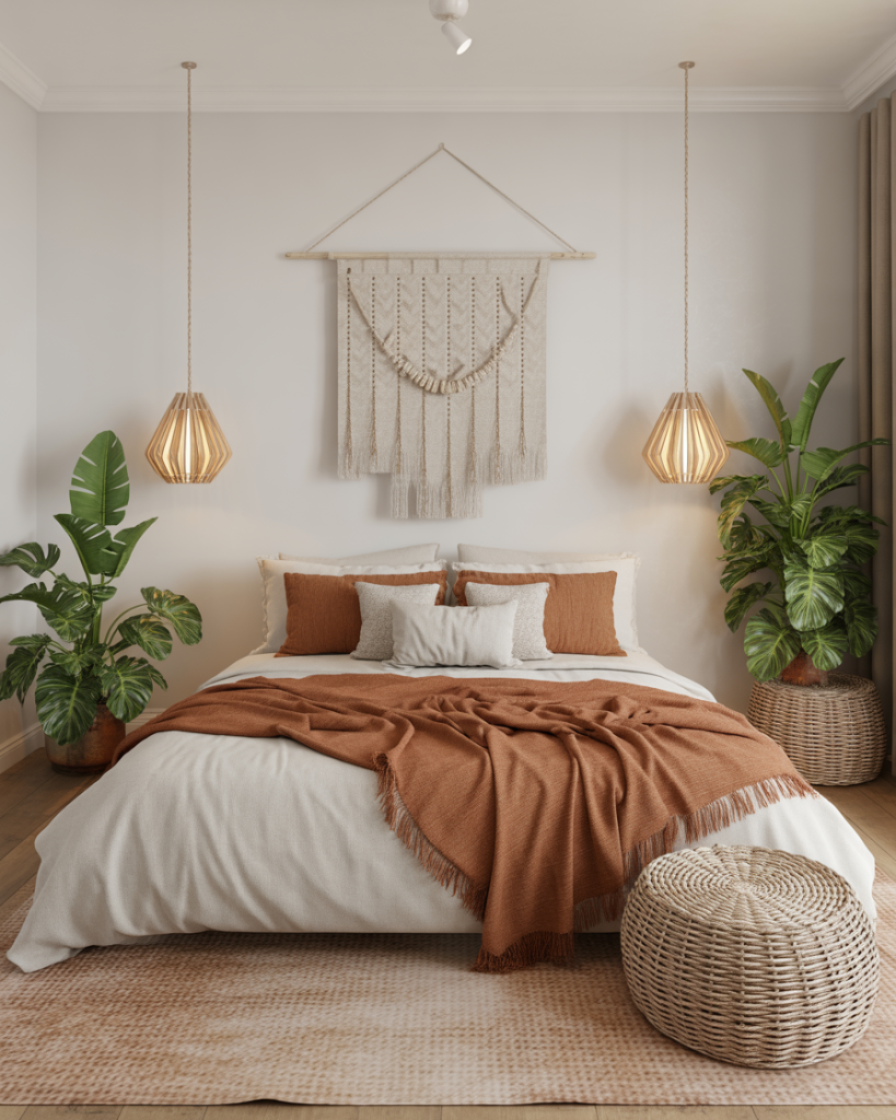 Bohemian style bedrooms are all about character and texture. Layer macramé, woven rugs, and embroidered cushions in earthy shades such as brown, sage, and neutral beige. Add plants and handmade art for that lived-in, relaxed bohemian look. The charm lies in the imperfection-every single piece feels collected instead of curated, rendering this truly authentic and artistic.