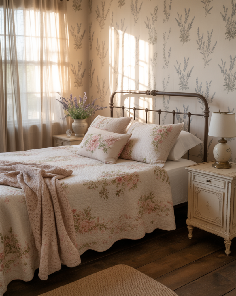 The cottage trend will roll forth into 2026 with delicate floral wallpapers, quilted blankets, and ruffled linens. Go for pastel green, dusty blue, or creamy neutral shades for a nostalgic, yet relaxing bedroom. It is a design that roots itself in comfort, spurred on by country living but malleable to modern homes seeking a touch of softness and warmth.